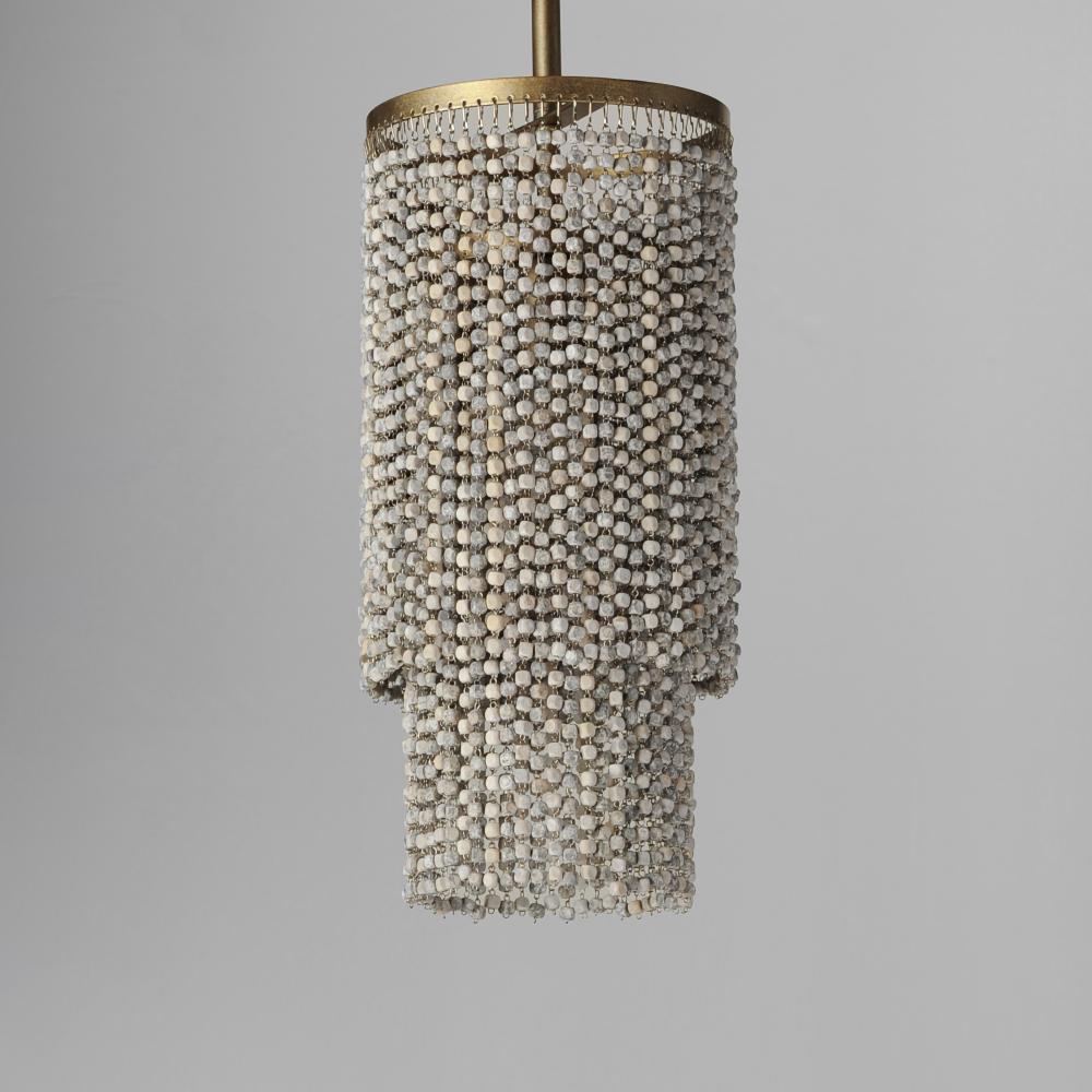 Cascading strands of square Weathered Wood beads are suspended on an offset spiraling frame finished in hand-applied Golden Silver leaf. The craftsmanship of the design is complimented by the soft glow of light within adding ambience to any space. Availabl