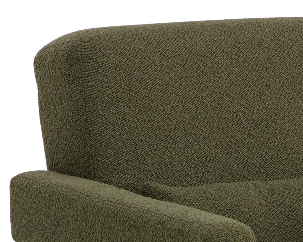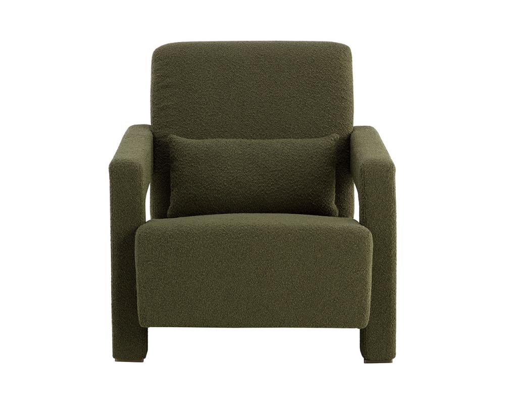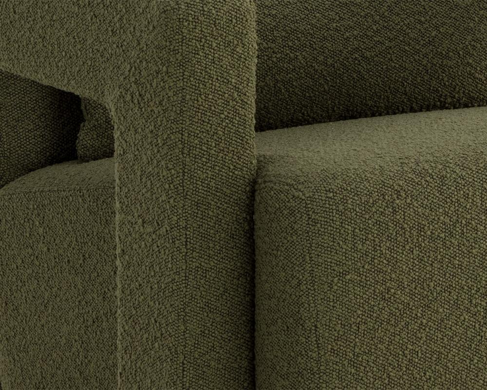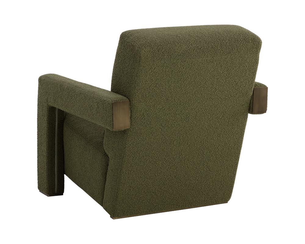 Strong angles and plush seating allow the Forester Lounge Chair to stand out in any living space. Upholstered in copenhagen olive fabric with sculpted arms that give the reclining seat a floating appearance. Metal accents at the back of the armrests match the powder coated antique gold stainless steel base to finish the look.
