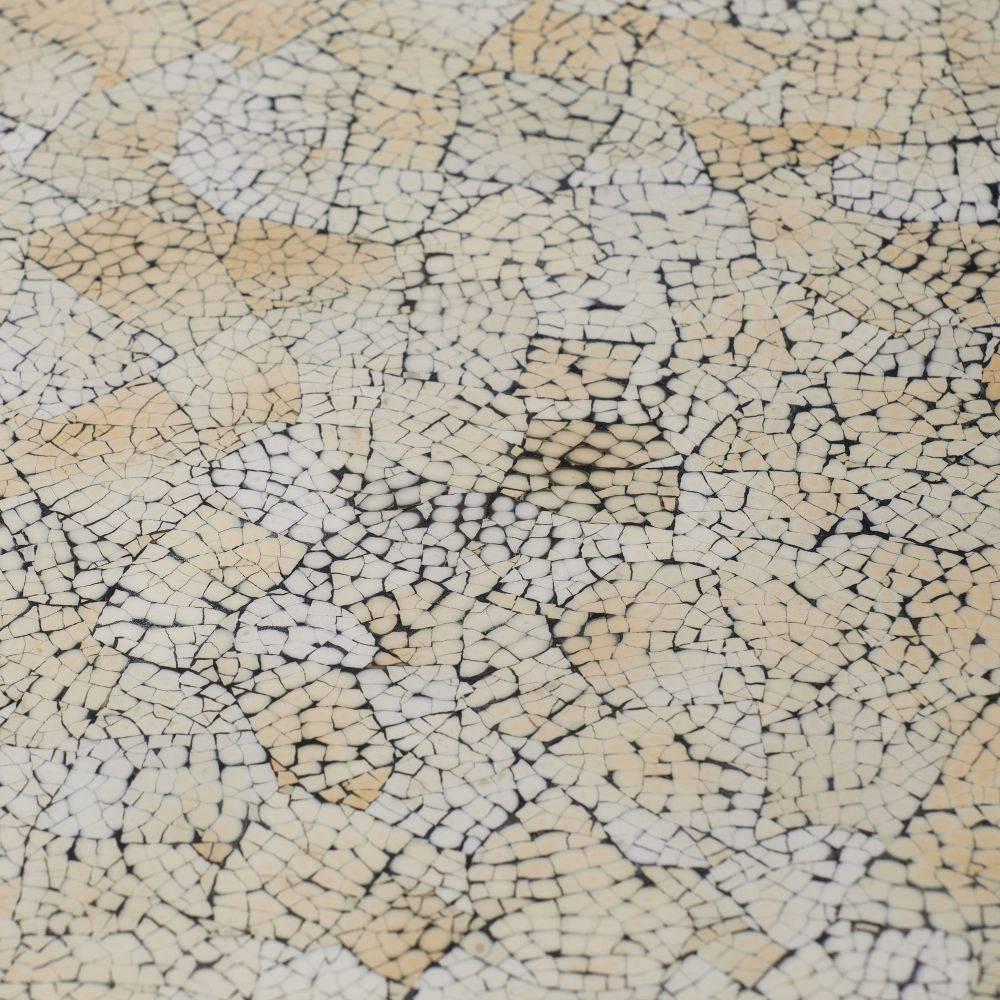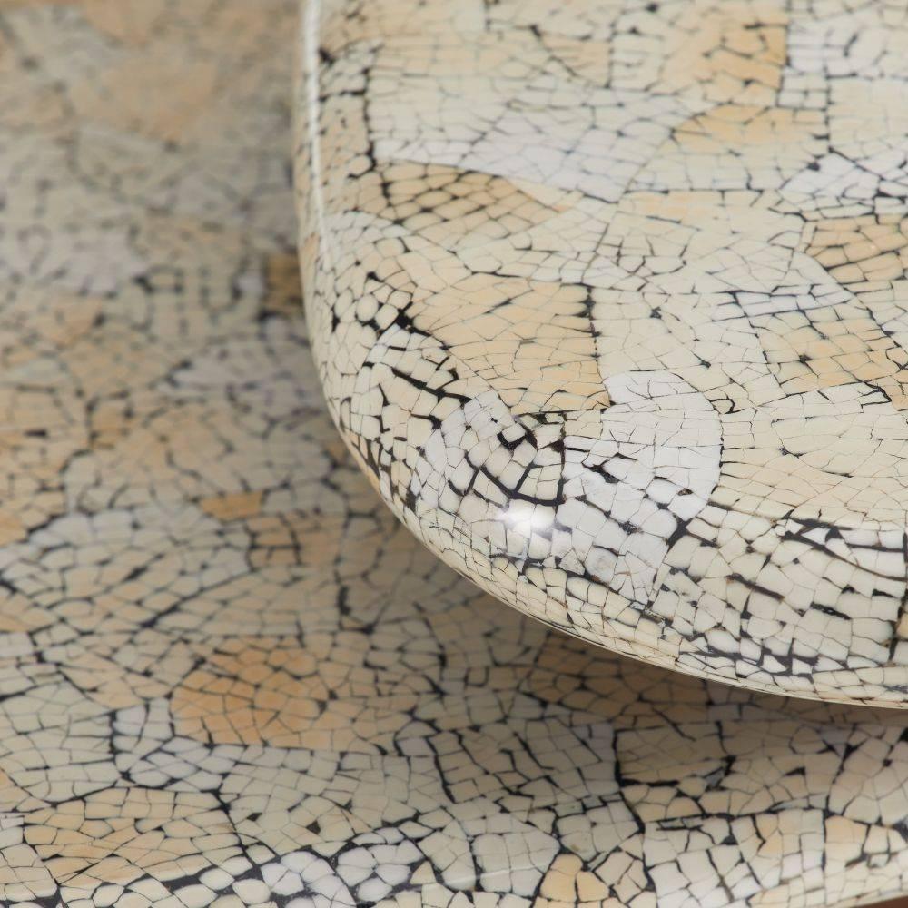 We updated the mid-century puddle table in satin walnut wood. A grounded base supports tiered tops suspended over a single shelf. Wrapped in a lacquered natural eggshell, it is finished with a handcrafted technique prominent during the French Art Deco era. Applied across each curved edge and lacquered, the varicolored result is unique to each piece. Finish will vary.