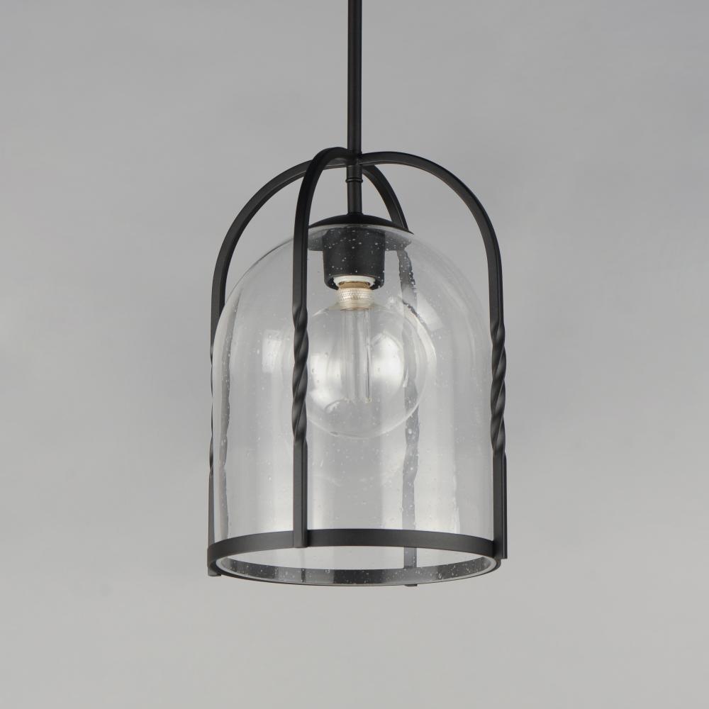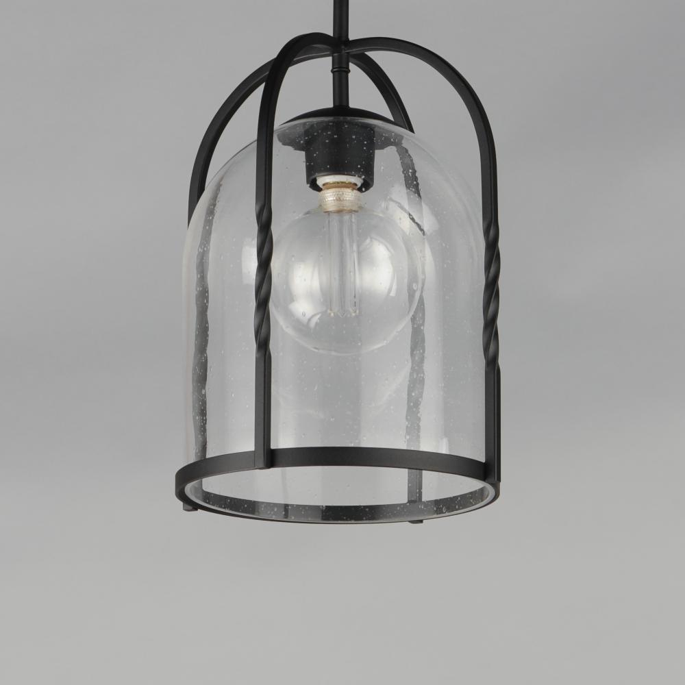 Forged iron spindles twist along the frame of a half round sconce. Transitional in design, they are finished in a Neutral Black outdoor rated powder coat and feature Clear Seeded glass. Use tubular lamps to accentuate the height of the sconces.