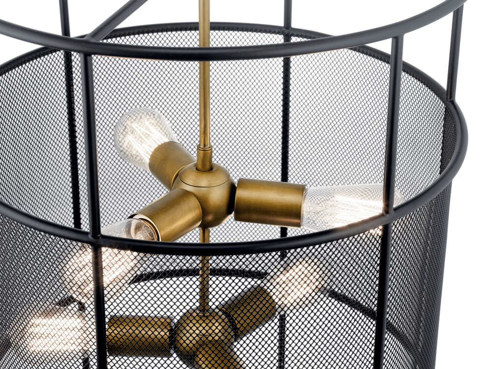 Two on-trend finishes deliver sleek industrial-era style on this Piston foyer pendant. Natural Brass accents add the shine, while a black mesh cage forms the structure.