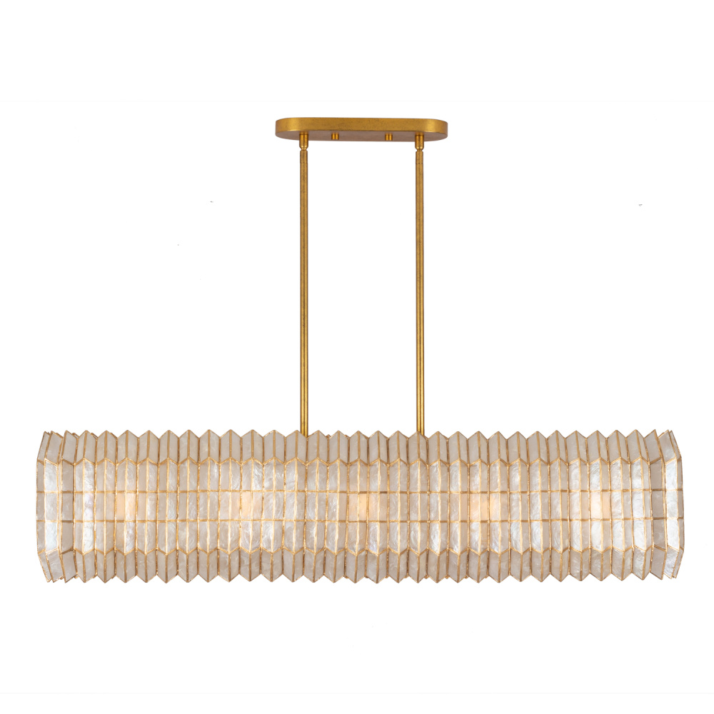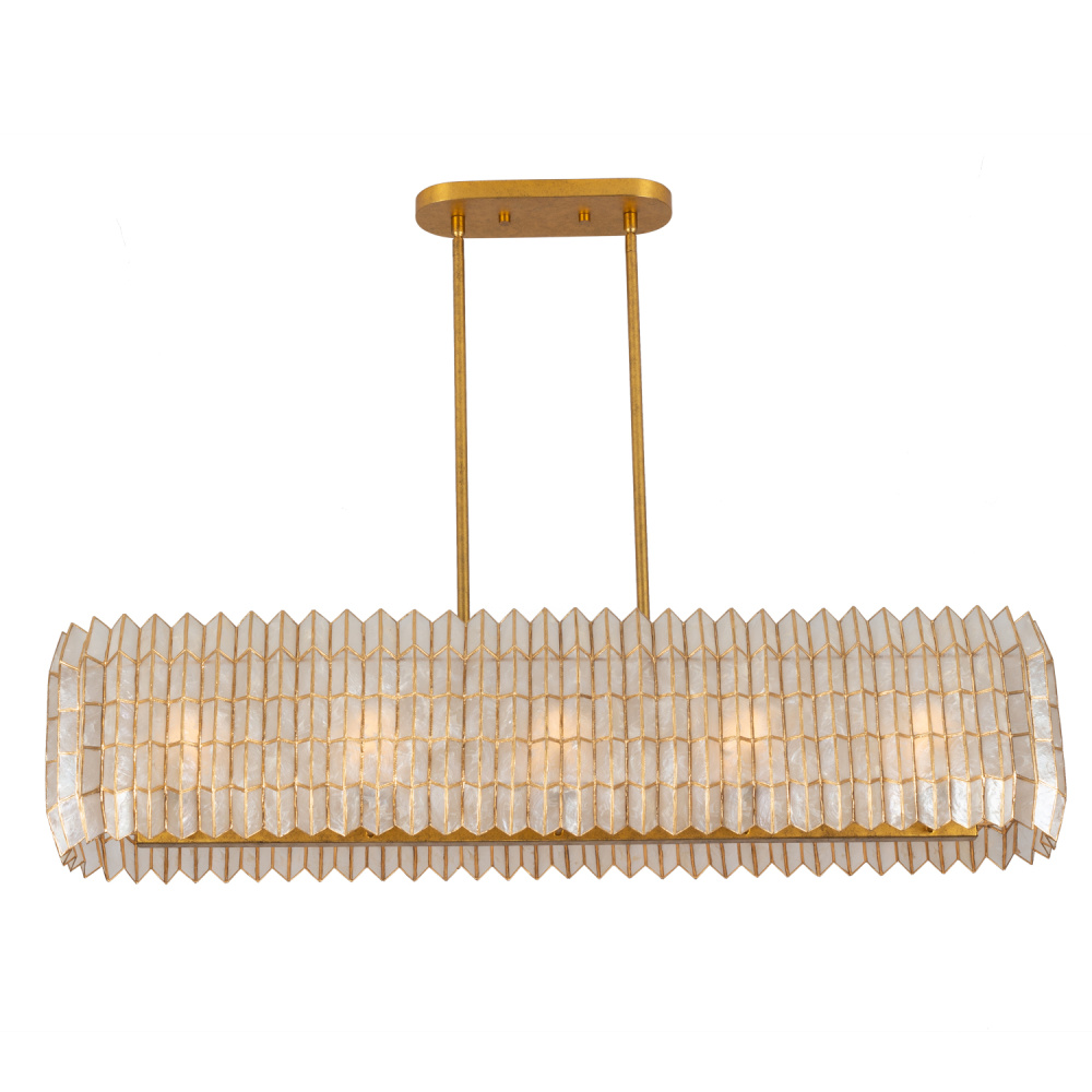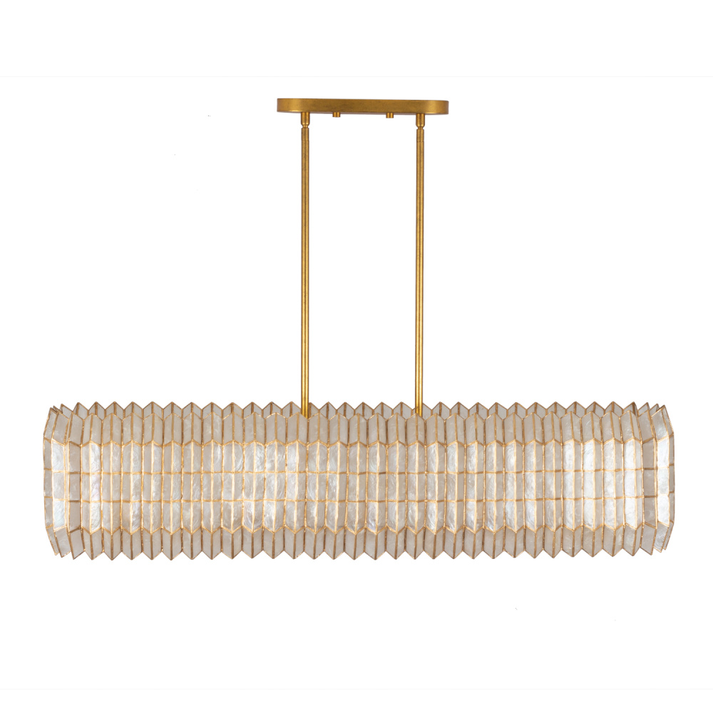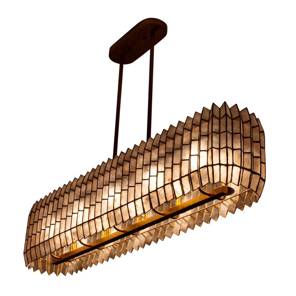 Drawing inspiration from origami, geometric designs, and the natural elegance of crystal cuts, the Fractal collection showcases a captivating zig-zag frame pattern mirrored in the capiz shade’s form. It emanates a gentle, warm glow that beautifully highlights its intricate design and understated shape. The piece is completed with a hand-applied Oxidized Gold Leaf (OL) finish, adding a touch of refined artistry.
