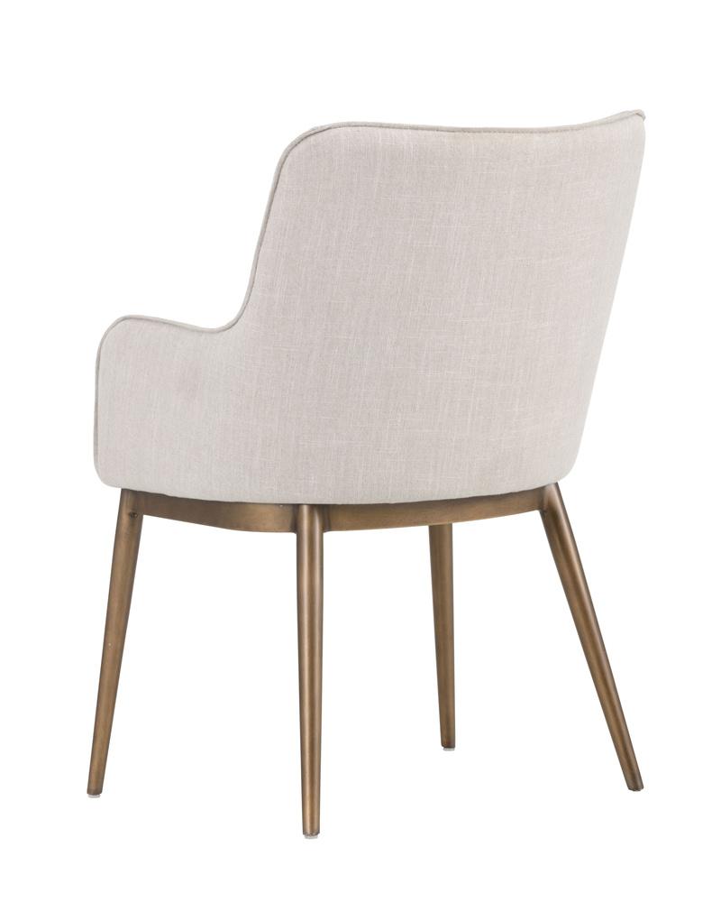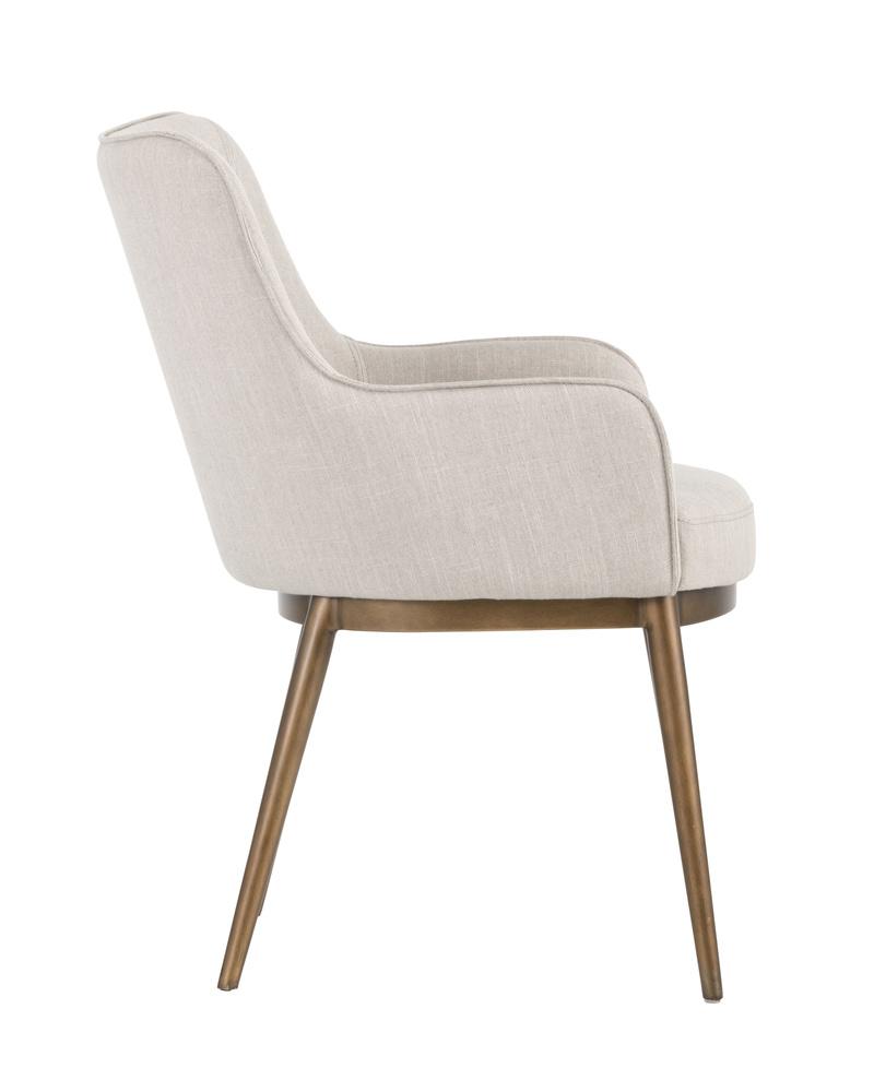 This compact barrel back armchair will add rustic and mid-century modern styling to dining and living spaces. In beige linen fabric with antique brass steel frame and legs.