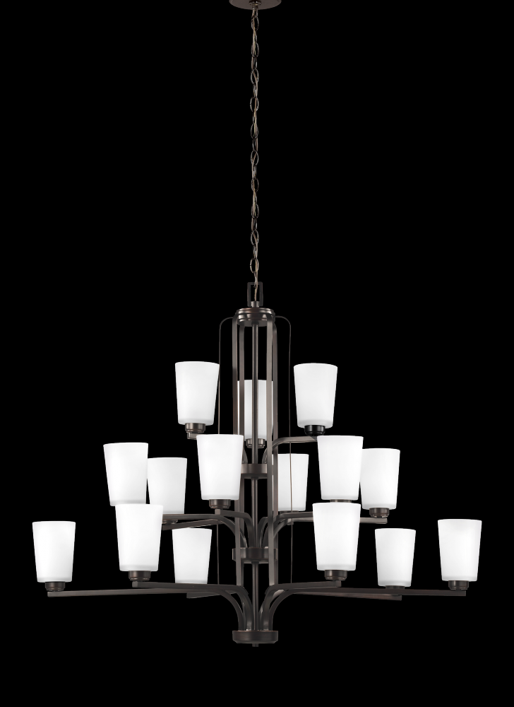 The Franport fifteen light multi-tier chandelier in bronze enhances the beauty of your home with ample light and style to match today's trends. Modernist influences abound in the Franport Collection. Shades with sharp lines and simplified bases showcase the minimalist approach with a twist. Franport has fixtures for all parts of the property. Available in both Burnt Sienna and Brushed Nickel finish choices as well as Nickel for bath fixtures. with fixtures in various sizes and configurations, the Franport Collection will coordinate the same design theme across several different rooms. Its assortment includes three-, five-, nine- and fifteen-light chandeliers; and one- two-, three- and four- light bath vanity fixtures. The Franport collection pars wonderfully with Geary ceiling fixtures. Incandescent and ENERGY STAR-qualified LED lamping are available; all fixtures are California Title 24 compliant.