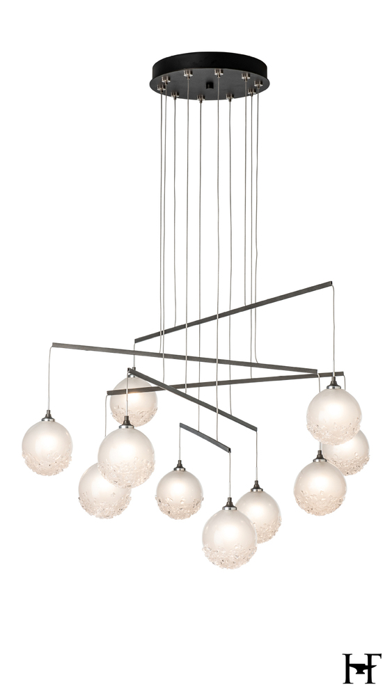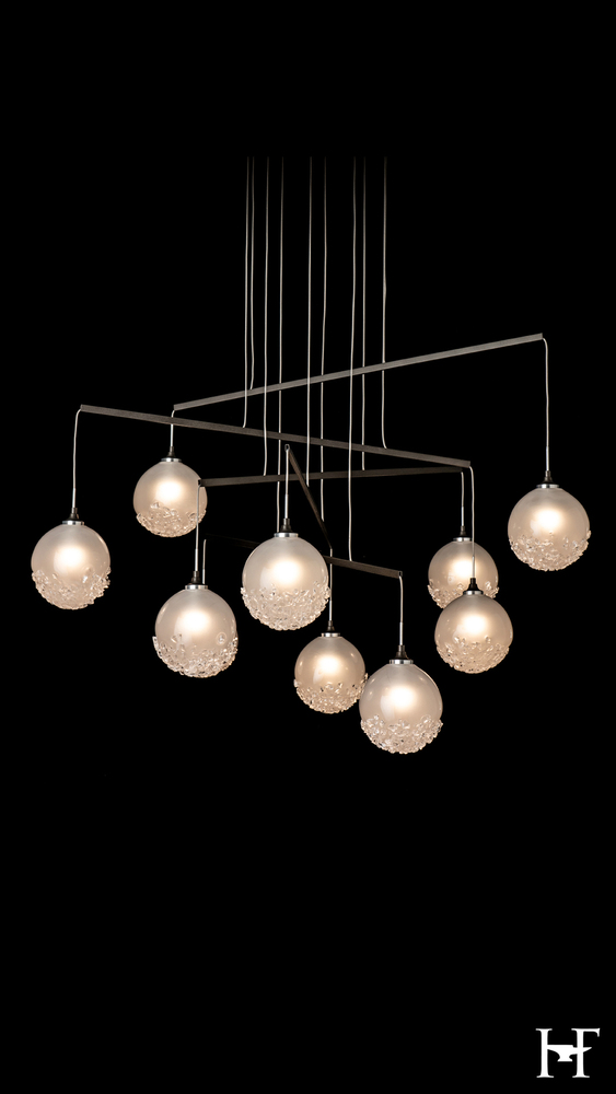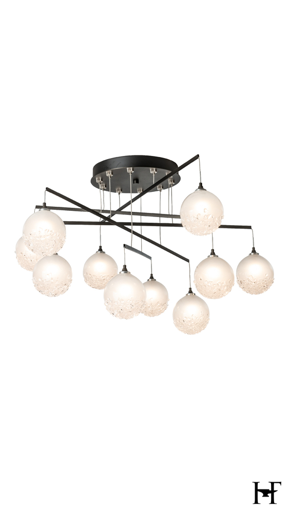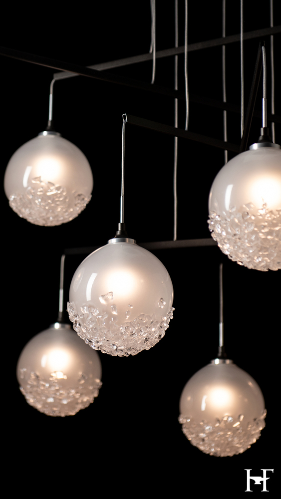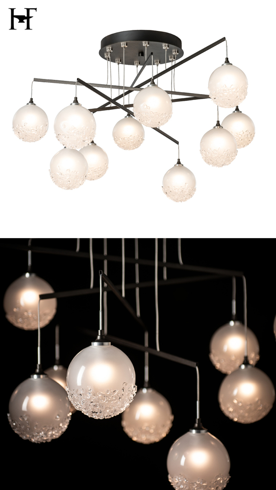 A beautiful way to illuminate any room, the Parasol semi-flush fixture is both delicate and impressive. Each arm was designed to nest a pieced of slumped art glass to great effect. According to HF designer Jason Hancock, a "milky" candelabra bulb is the ideal choice to give this fixture the most elegant look.