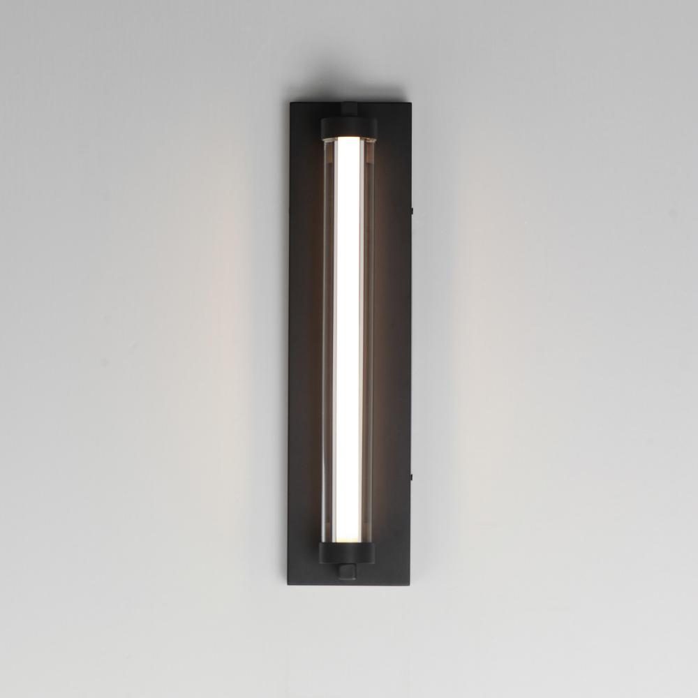 Within a solid tube of Clear glass, a White cylindrical acrylic tube encases omnidirectional LED light. Its frame is constructed of aluminum finished in Matte Black and extends less than 4 inches from the wall for ADA compliance making this collection suit