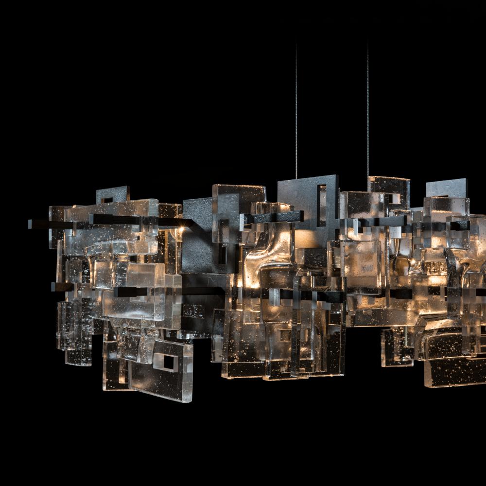 Part of ART + ALCHEMY by Hubbardton Forge, the Fusion Pendant is a modern pendant light that is perfect for any space. The staggered layers of thick, clear, seeded fused glass are displayed on a geometric metal framework. Incandescent bulbs give a warm wash of light over the entire composition.