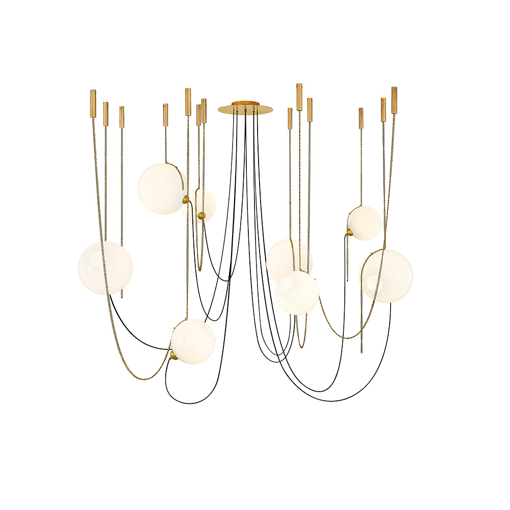 Striking style collides with dramatic energy in our extraordinary Galileo pendant light. Each glossy opal orb will glow from above like a polished planet in your very own solar system. Warm aged brass chain drapes delicately between each of Galileo's eight globes creating an endless variety of orbits, and a graceful display of light and movement that will leave beholders captivated.