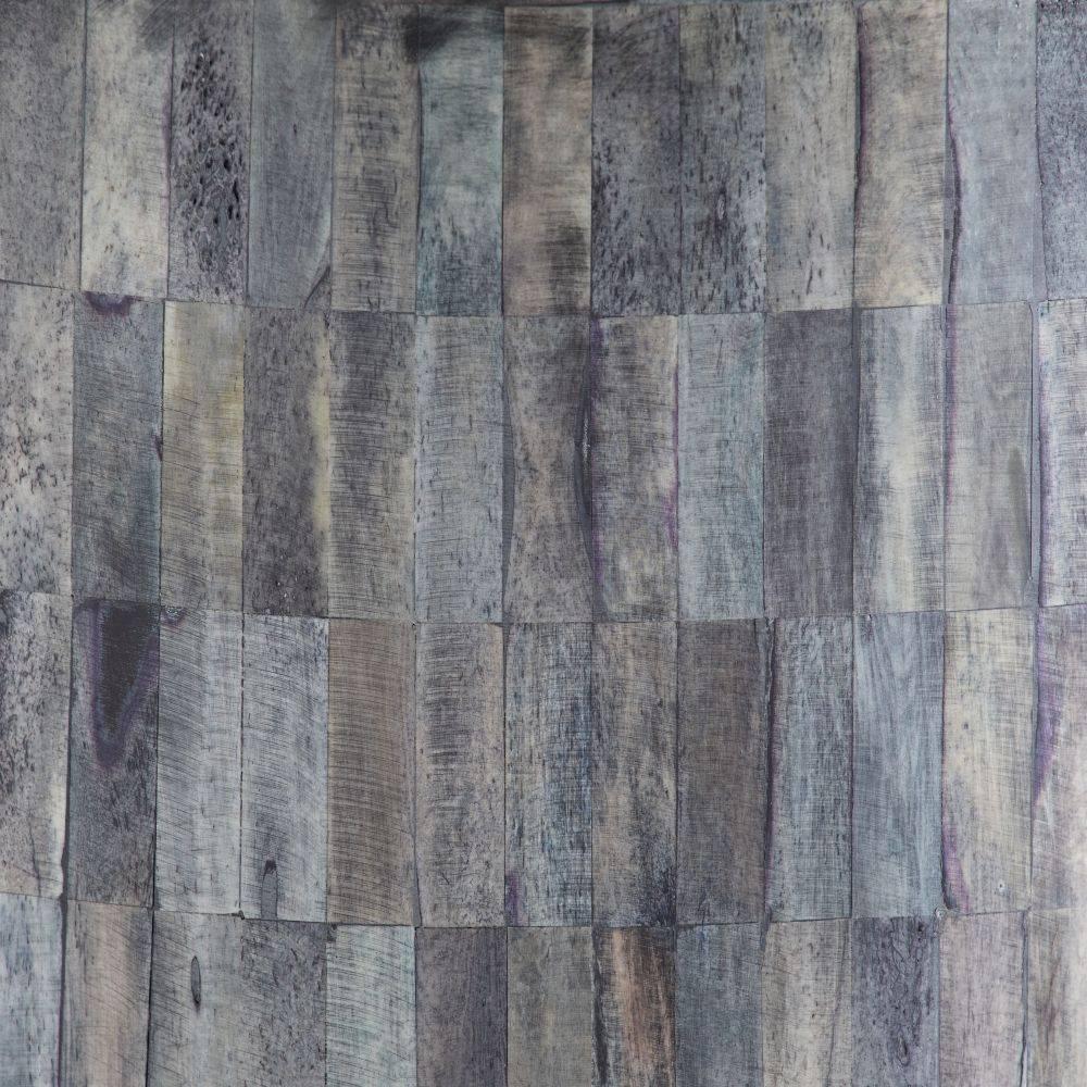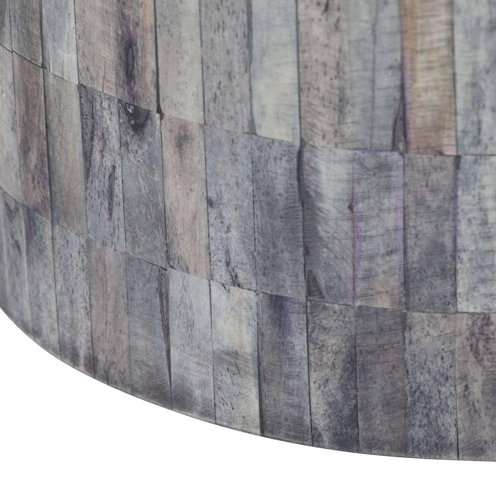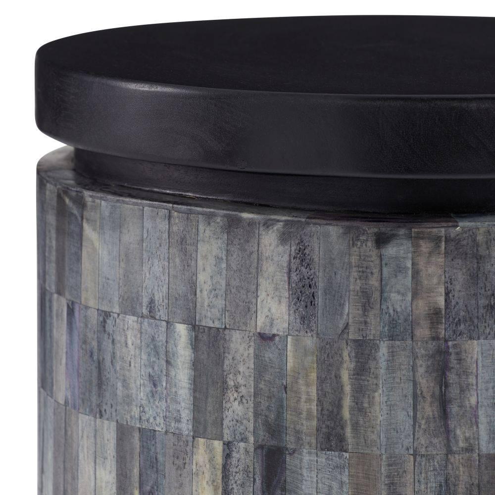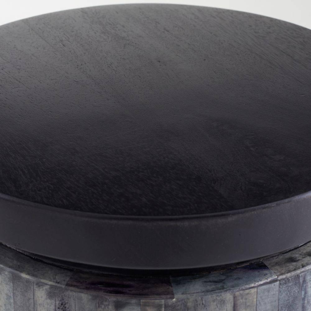 Applied in a mosaic fashion, bone tiles in varying shades of natural gray create a compelling irregular pixilated pattern on the Garner's base. The balance of warm and cool tones is complemented by a round top carved from ebony mango wood. Finish will vary.