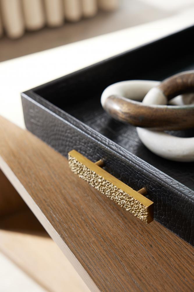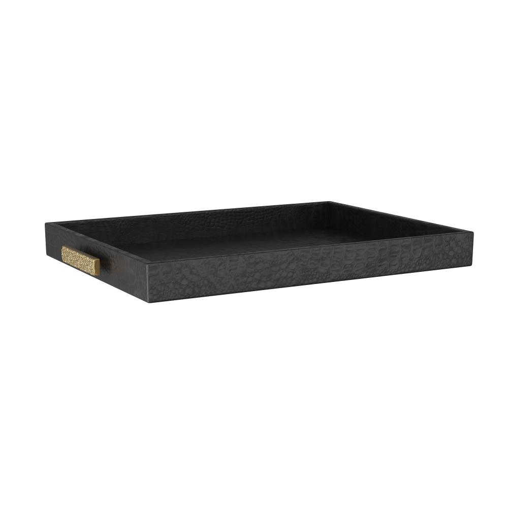 The black Italian leather Gavin tray is the perfect storage element for essentials, but it is not meant to be tucked away. Rich crocodile embossment is dressed in vintage brass handles featuring a striking pebbled texture.