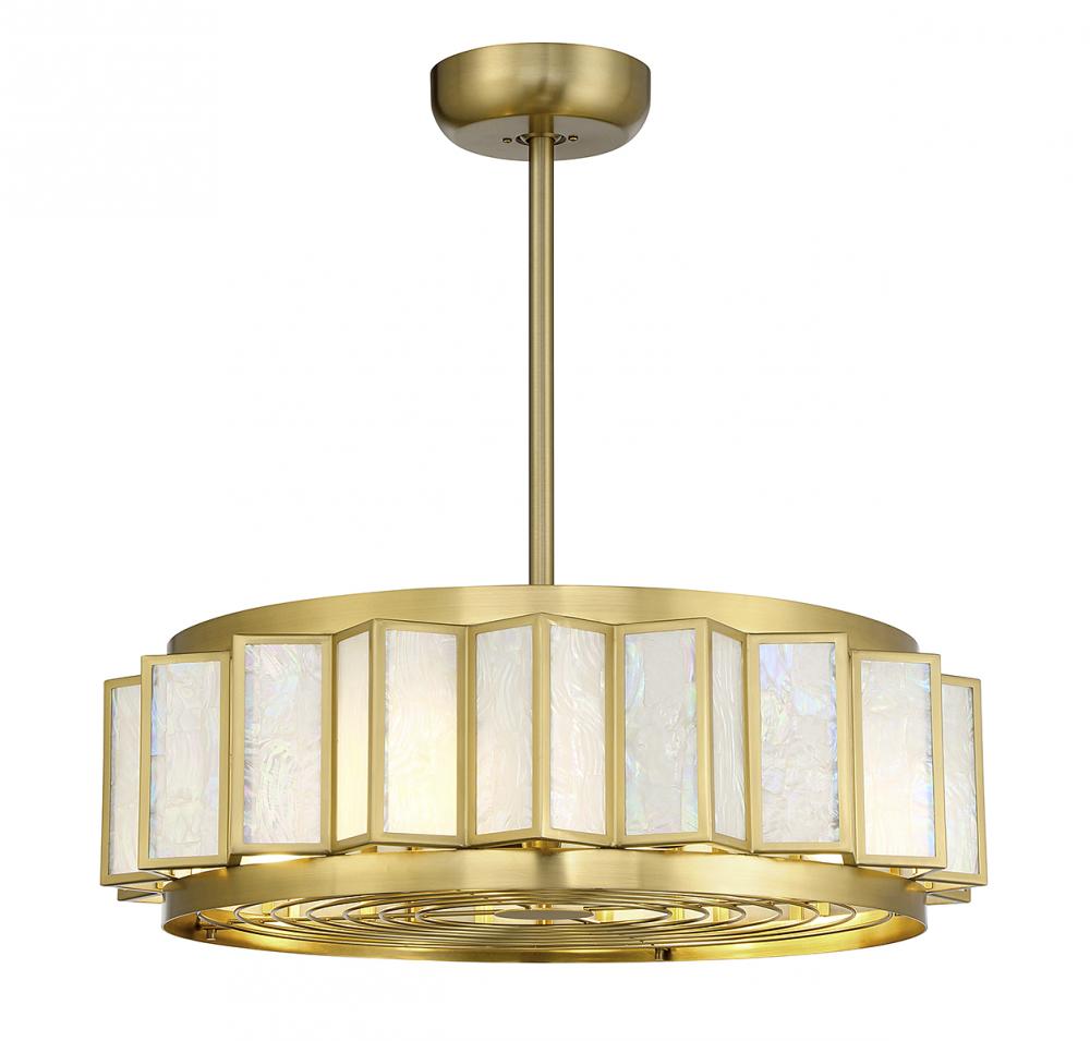 It is often said that lighting is the jewelry of the home and the Savoy House Gideon 4-light Fan D'Lier is an excellent example of this saying. Pieces of natural capiz shell are arranged into a boldly geometric frame with a warm brass finish. When the light is off, the unique swirls and patterns on the shell will mesmerize. When the light is on, the shell will create a beautifully soft glow. Gideon is 13.11" in height and 28" in width. Four 6-watt standard size LED bulbs are included. Fan D’Liers are a Savoy House exclusive that combines the best of ceiling fans with the best of chandeliers in one fabulously fashionable fixture. These custom designs are inspired by high-end designer styles and take top trends to a whole new level.