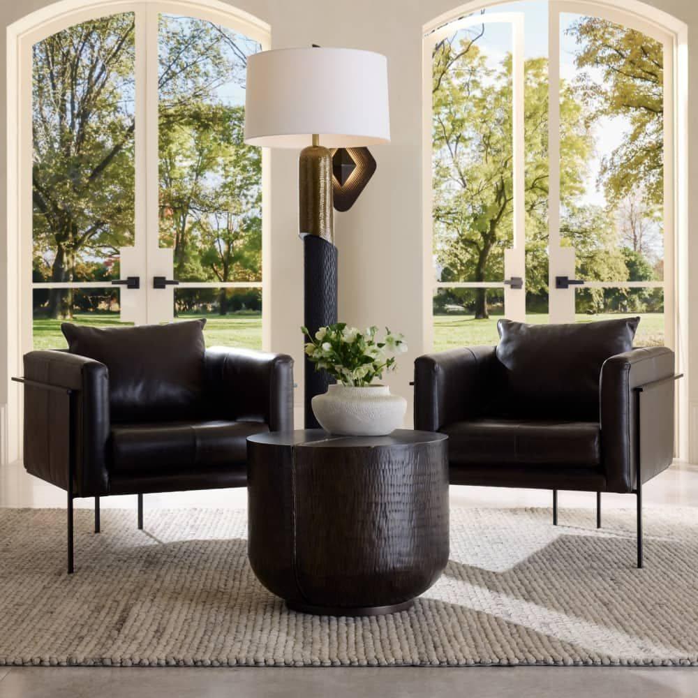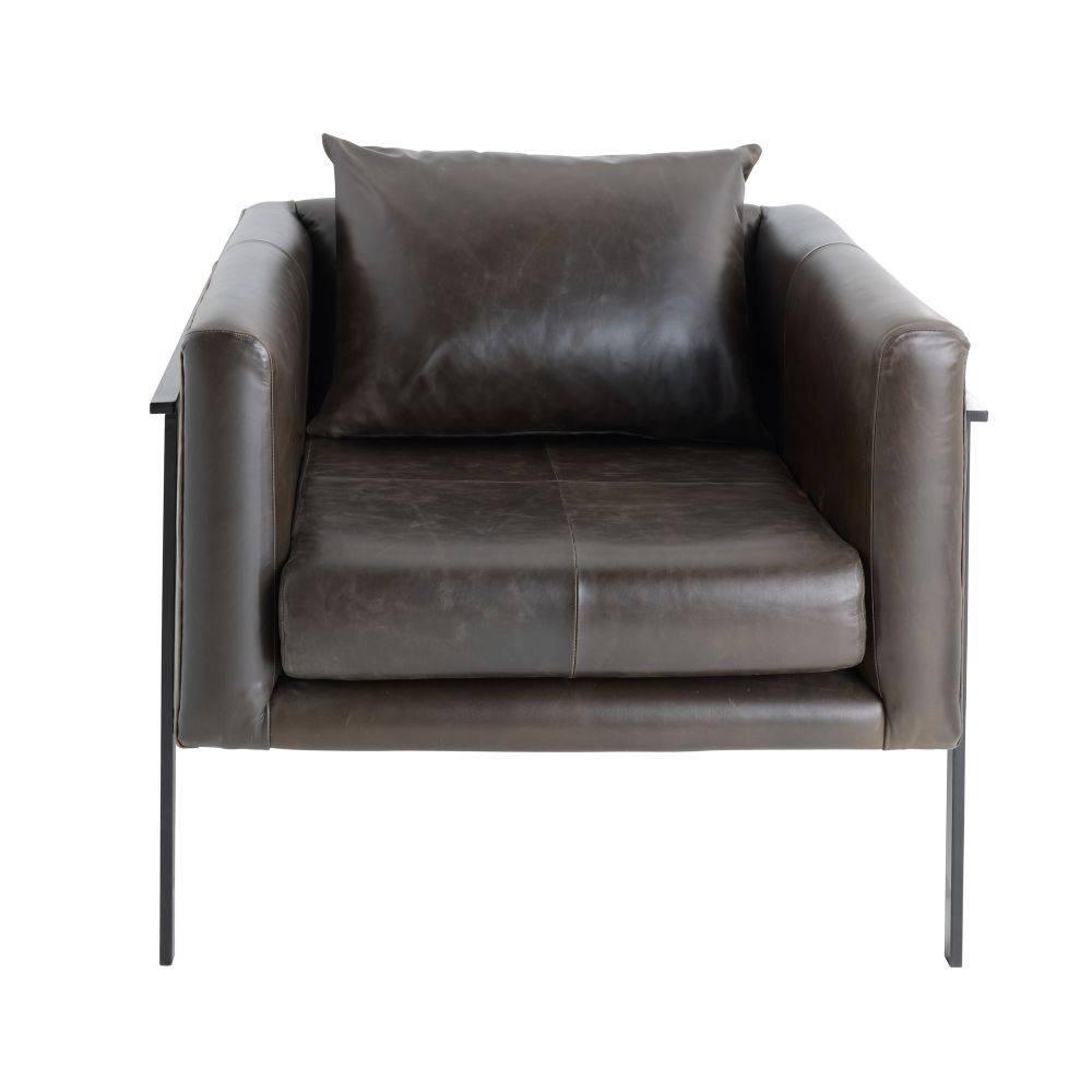 This modern club chair pairs a geometric form with sophisticated materials. An industrial frame of blackened powder coated iron cradles a seat of ore leather for a cantilevered effect. Cinched back legs and split-quarter stitching add to the masculine aesthetic. The matching seamed pillow provides support. Leather will vary.