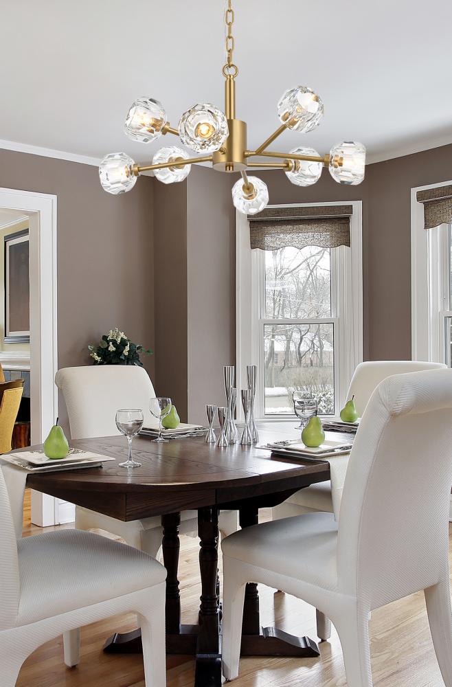 Hexagonal and pentagonal facets on the 4 inch crystal spheres tastefully diffuses the soft illumination from each arm