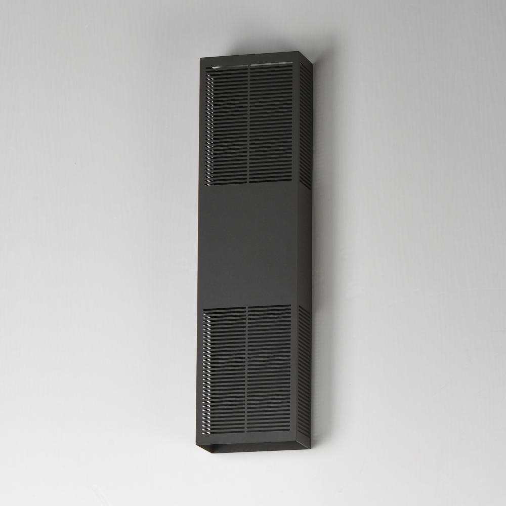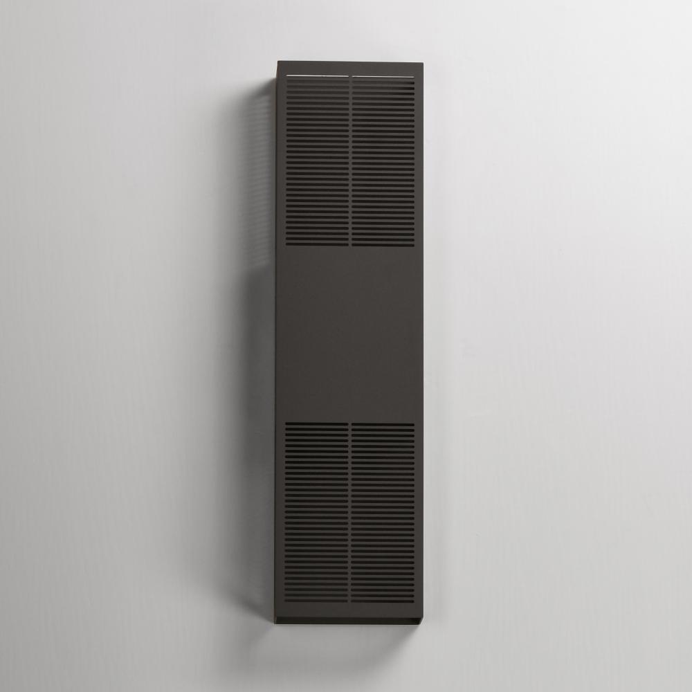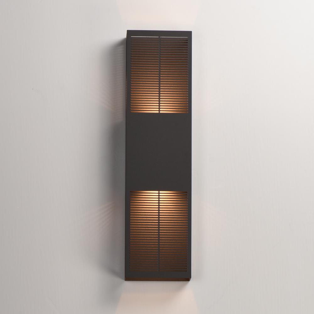 An array of precise slits are stacked in two columns on rectangular shade forms of various sizes. Housed in a blocked out space is a recessed LED light source that casts a filigree that radiate onto the surface surrounding the sconce making a dazzling disp