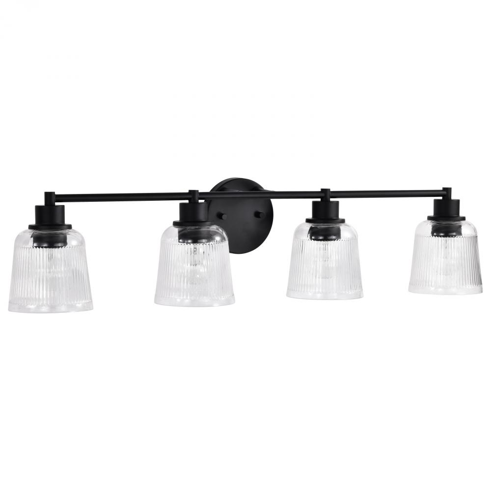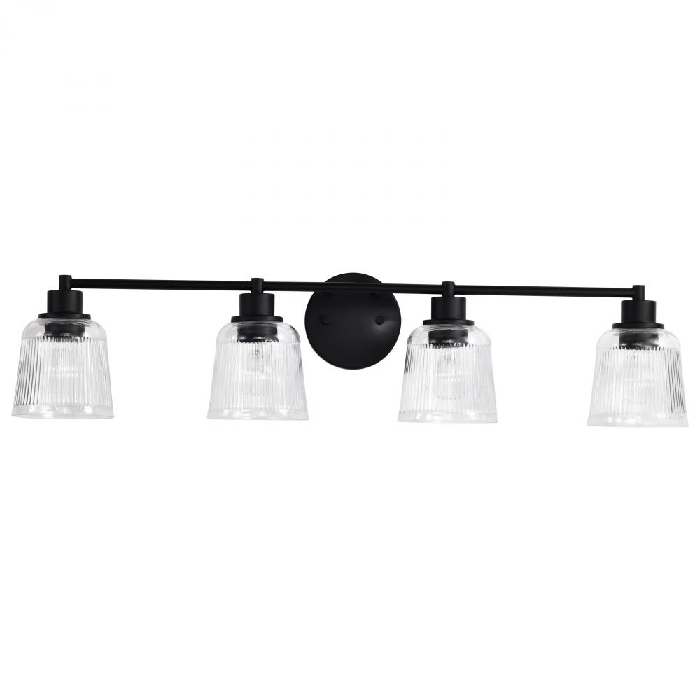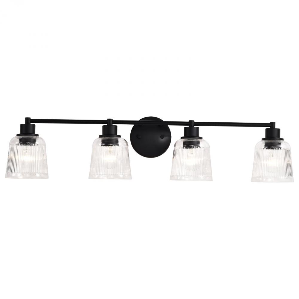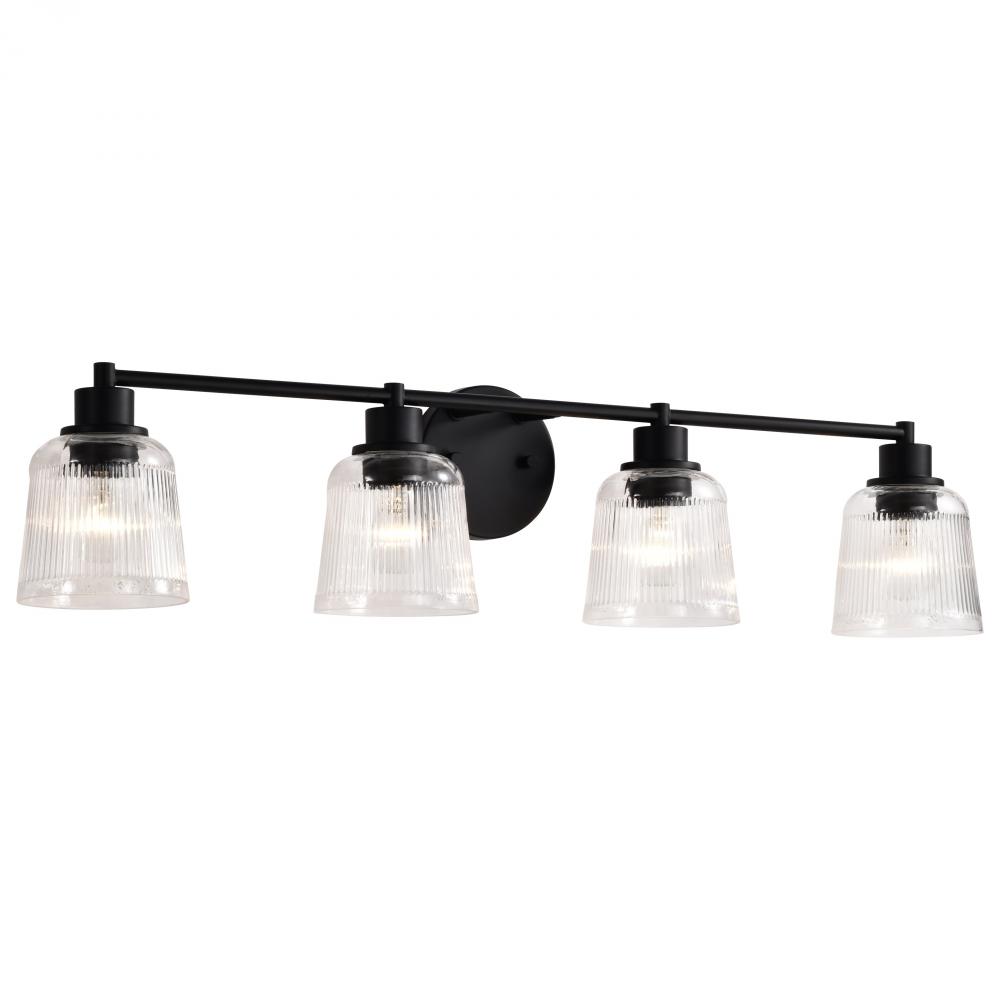 Grayson; 4 Light Vanity; Matte Black Finish; Clear Ribbed Glass