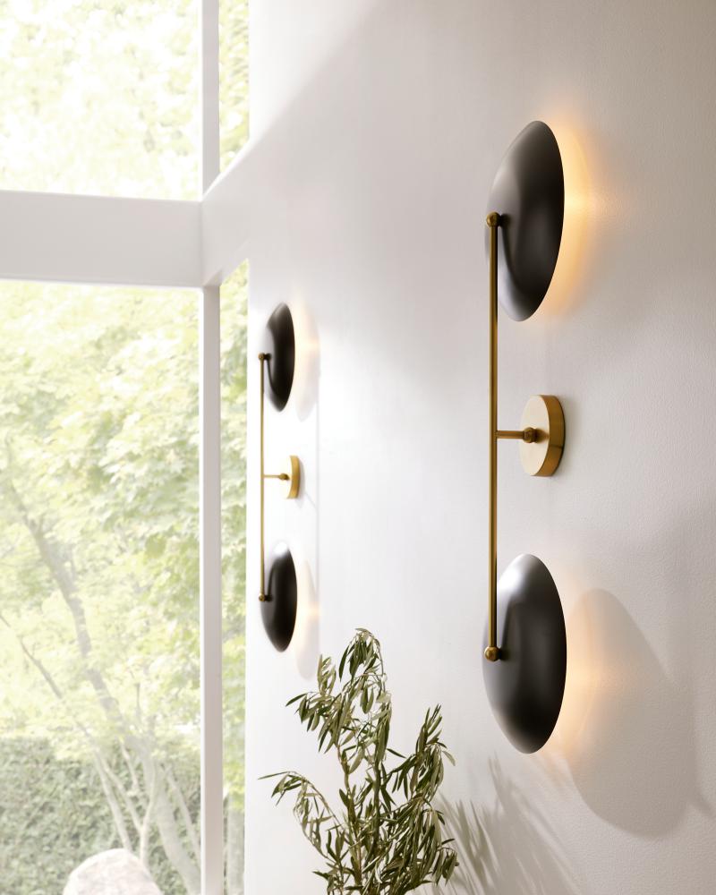 A spin-off of our stylish Griffith, this delicate sconce balances a severe bronze finish with an elegant antique brass frame. The bronze plates face forward to diffuse the light and create a warm, even glow. Created with ADA depth, it is an ideal option for corridor lighting.