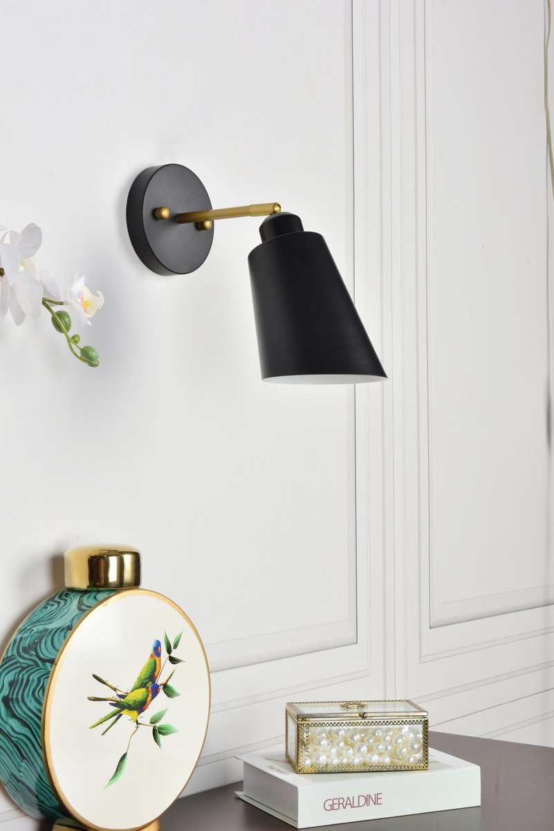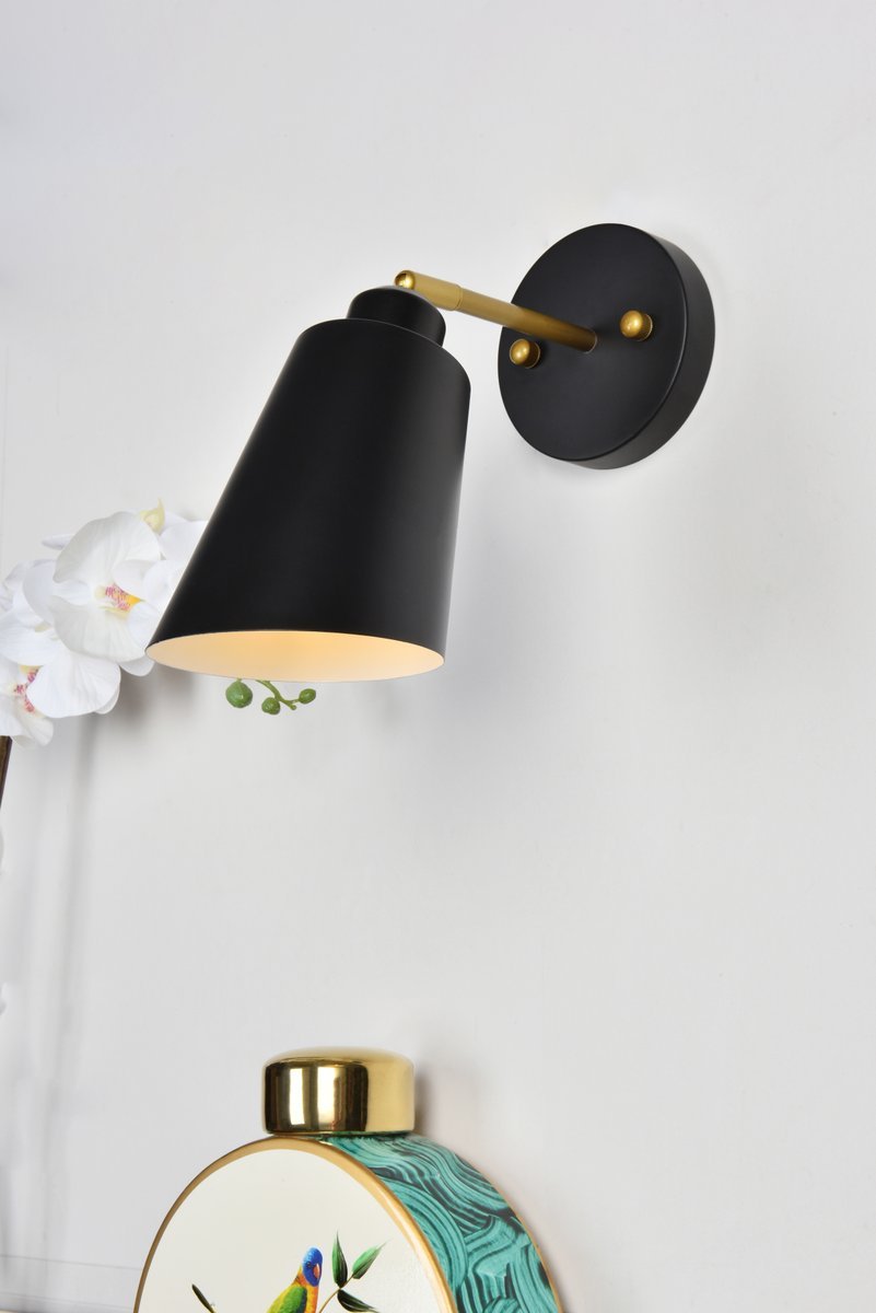 Illuminate your space with the brilliance of the Halycon Collection wall sconce. The cone dome creates a unique lighting and includes a dimmable feature that creates a calm mood. Available in a black and/or brass finish, this minimalistic piece will fit perfectly into your living room or bedroom. This product comes in a five or six inch length and requires one E26 socket. Light bulbs not included.