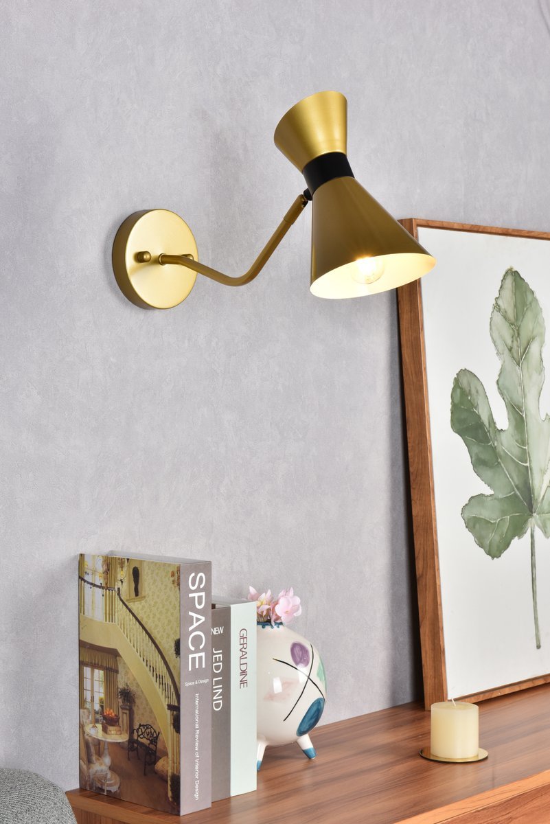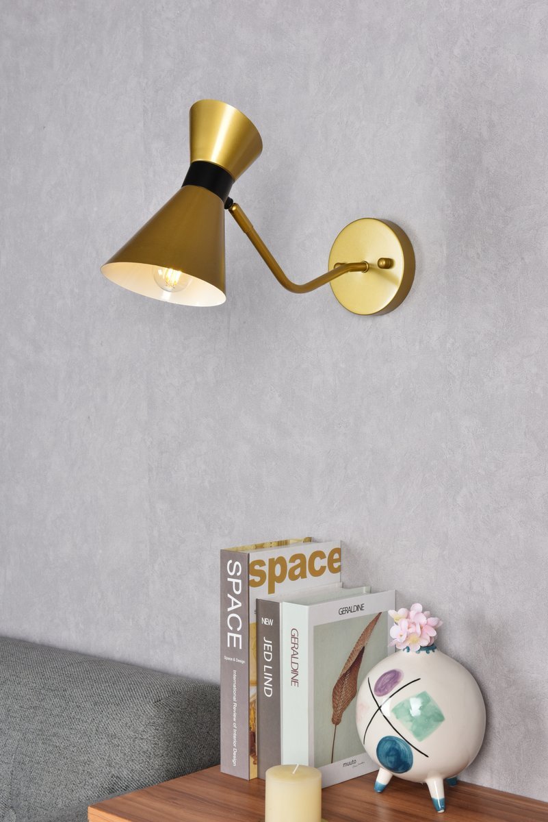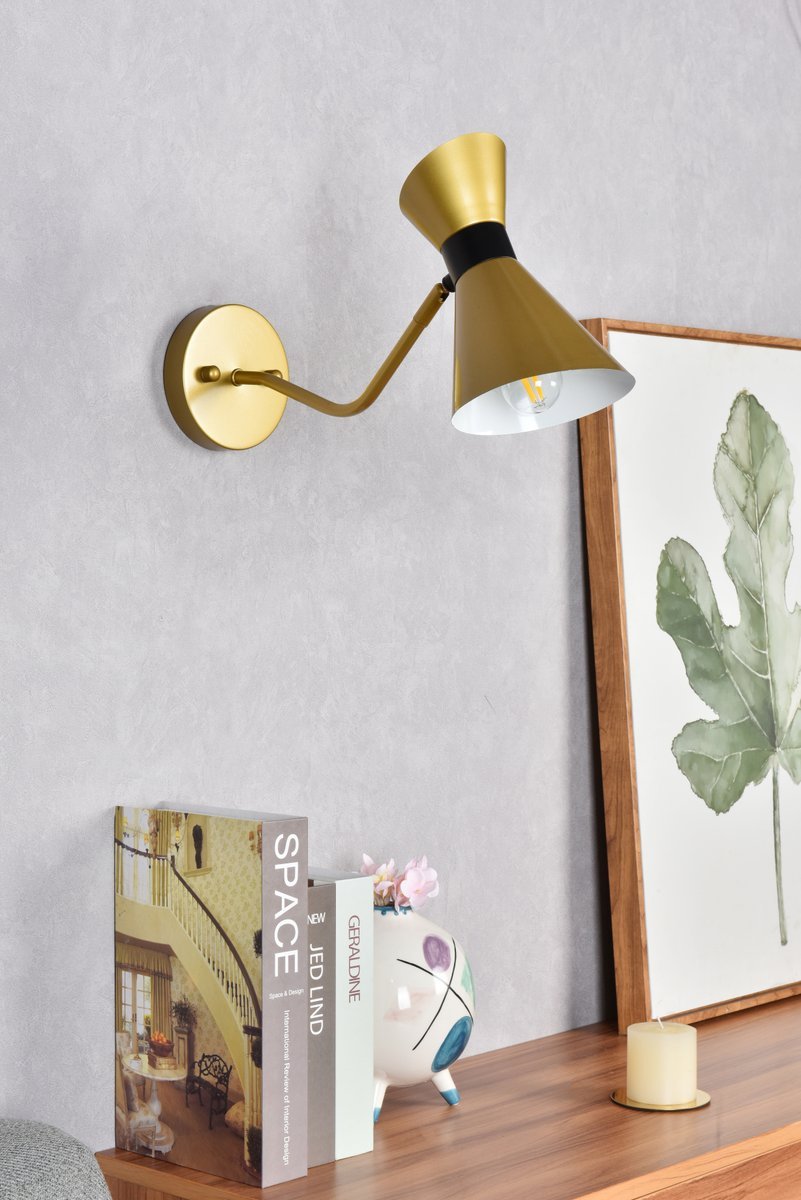 Illuminate your space with the brilliance of the Halycon Collection wall sconce. The cone dome creates a unique lighting and includes a dimmable feature that creates a calm mood. Available in a black and/or brass finish, this minimalistic piece will fit perfectly into your living room or bedroom. This product comes in a five or six inch length and requires one E26 socket. Light bulbs not included.