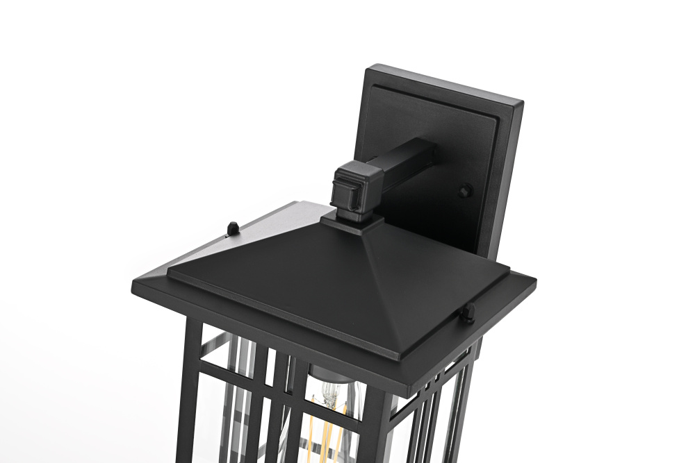 The square backplate provides a stable mount while complementing the lantern’s structured design.