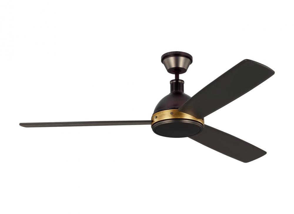 The Thomas O'Brien Hicks 60 in Deep Bronze with Hand-Rubbed Antique Brass features a 178.0 X 22.0 6 speed motor with a Thirteen degree blade pitch. Inspired by Thomas O’Brien’s Hicks vintage pendants, a new introduction of ceiling fans are flawlessly implemented with industrial charm. The beautifully shaped integrated LED shallow dome, while the signature metal band with rivet details becomes the spinning blade element. Available in two finishes.