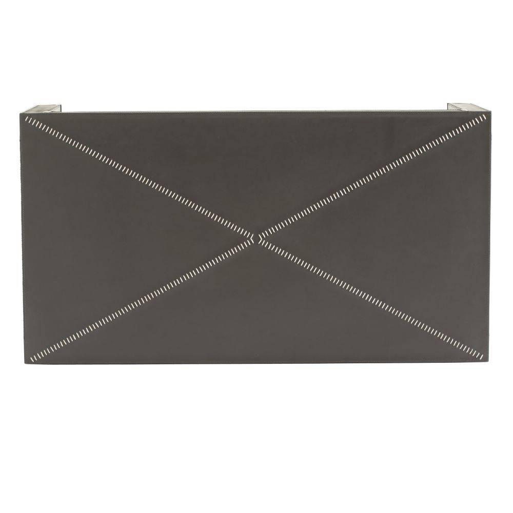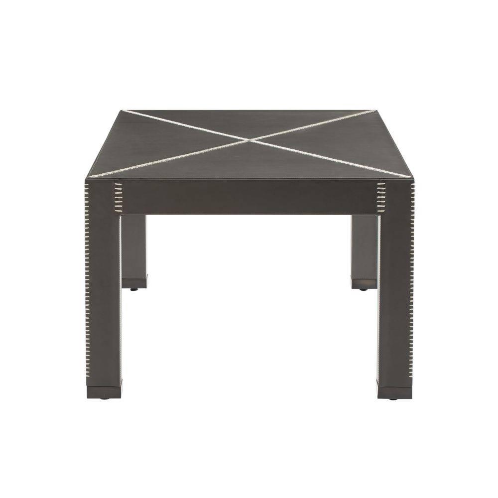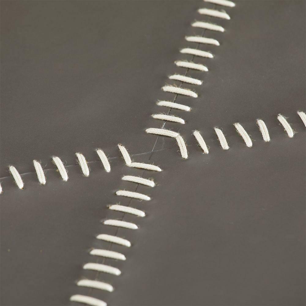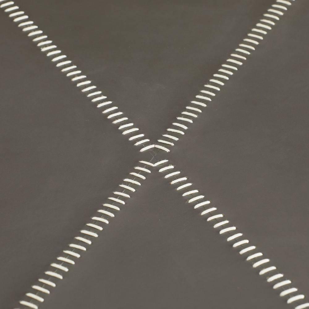 A striking graphic X whipstitched detail borrowed from tailoring dresses up the surface of a Parsons-inspired table. Covered from top to blackened bronze-tipped legs in dim gray leather, the Hidalgo's nestable height allows an ottoman or poof to be stashed underneath. Leather will vary.