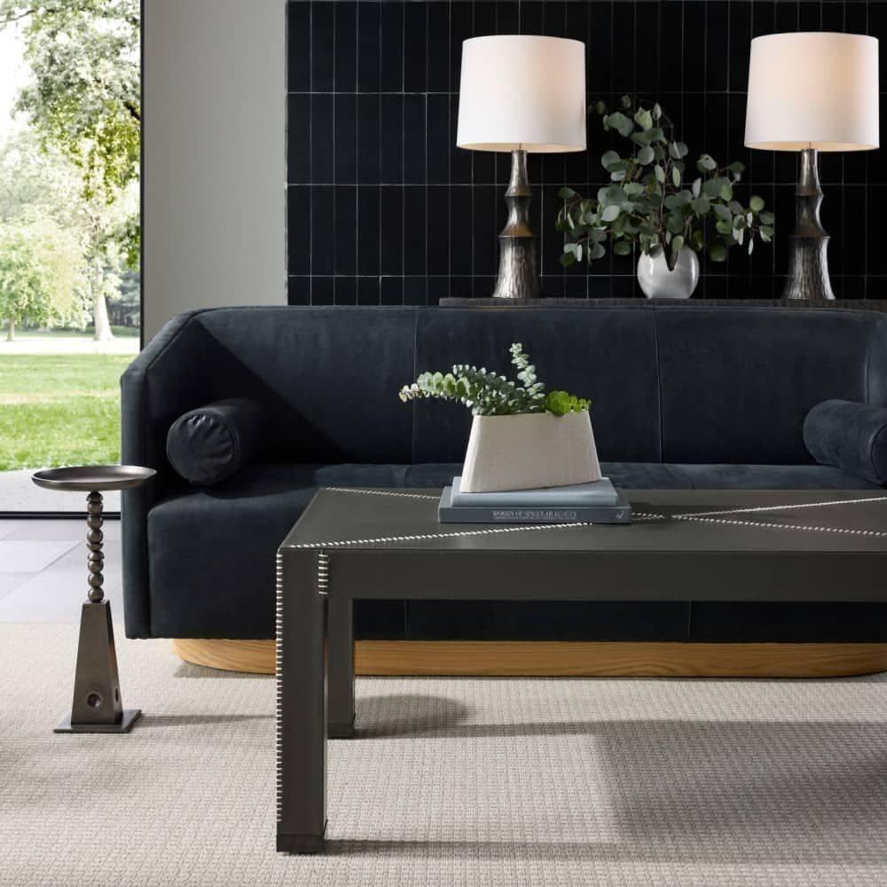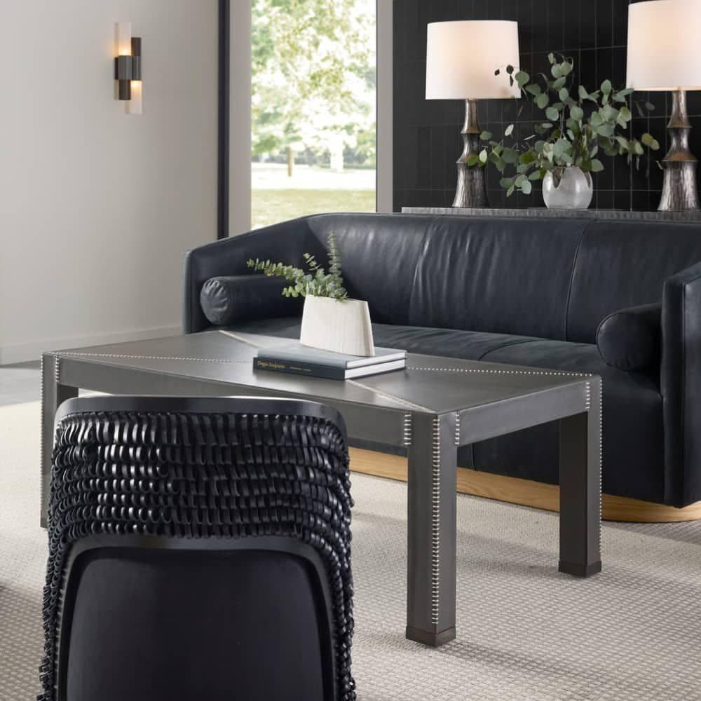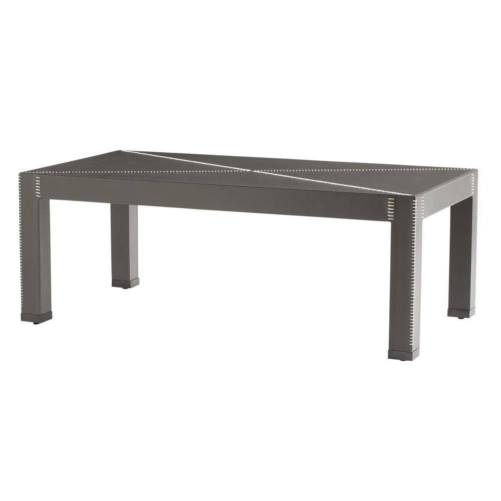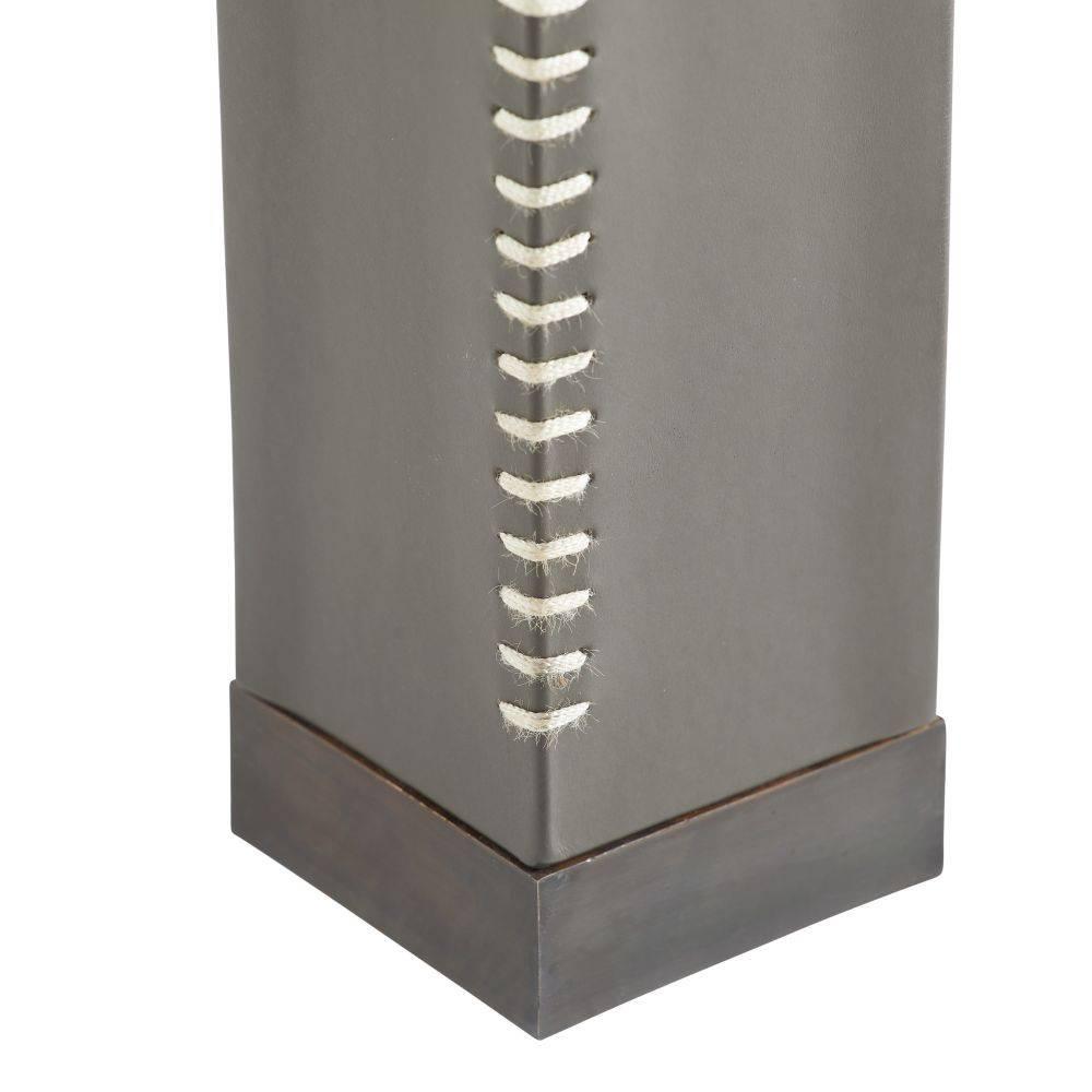 A striking graphic X whipstitched detail borrowed from tailoring dresses up the surface of a Parsons-inspired table. Covered from top to blackened bronze-tipped legs in dim gray leather, the Hidalgo's nestable height allows an ottoman or poof to be stashed underneath. Leather will vary.