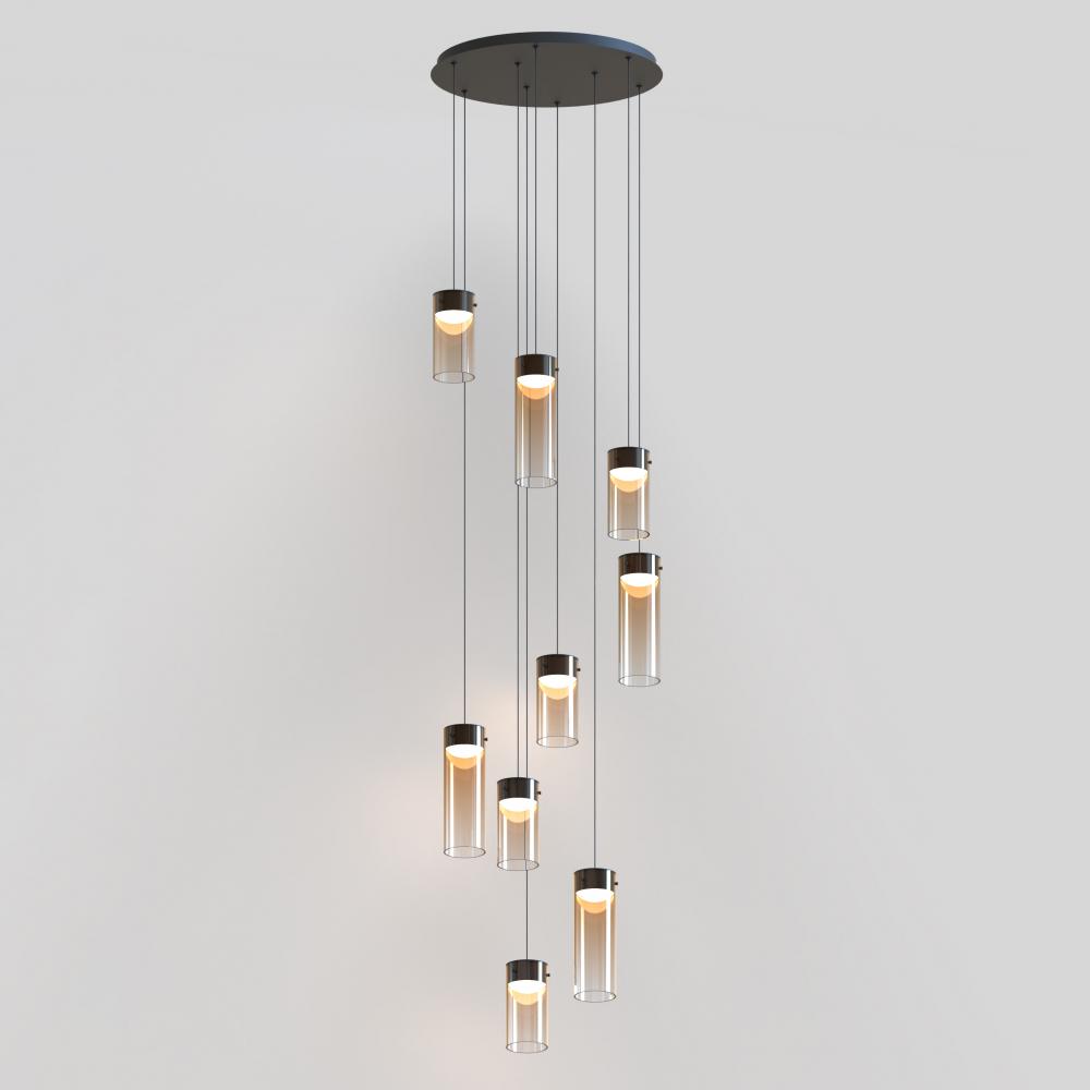 Minimalist in form and futuristic in styling, a gradient color effect applied to cylindrical glass shades provides a dynamic lighting effect. A Polished Gunmetal LED housing supports the glass adds a mirror like effect to the highly reflective glass. The r