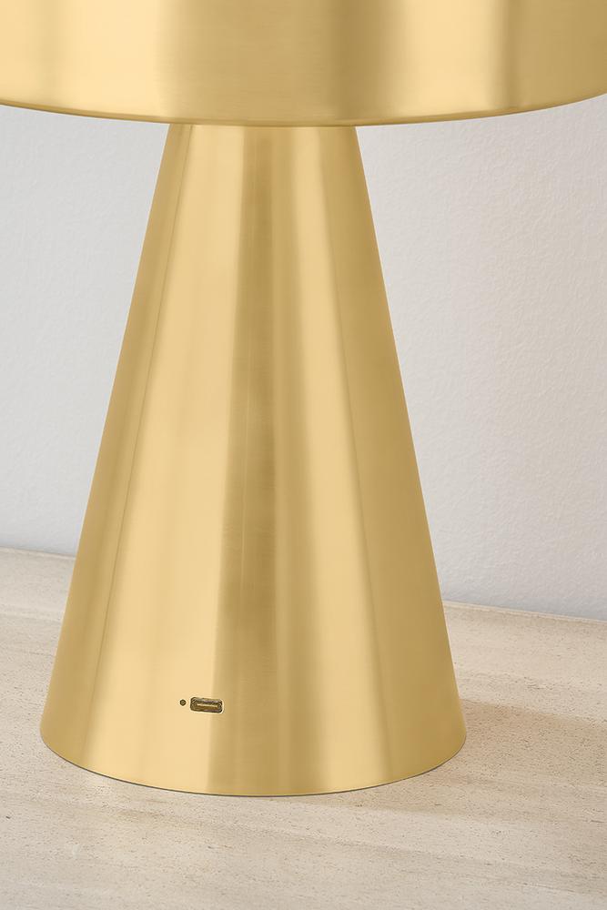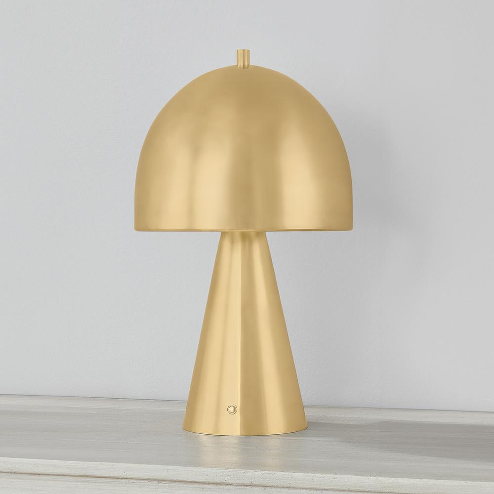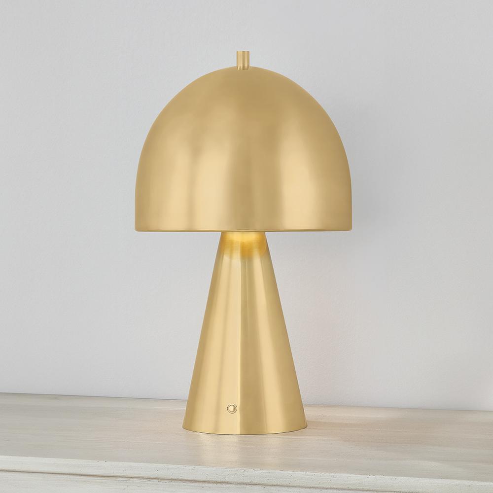 The contrast between the oblong domed shade and the conical base of Hopkinton creates a striking geometric design. Whether this petite lamp is finished in Aged Brass or Distressed Bronze, the on-trend mushroom silhouette adds a dose of personality. Its integrated rechargeable LED light source ensures lasting functionality.