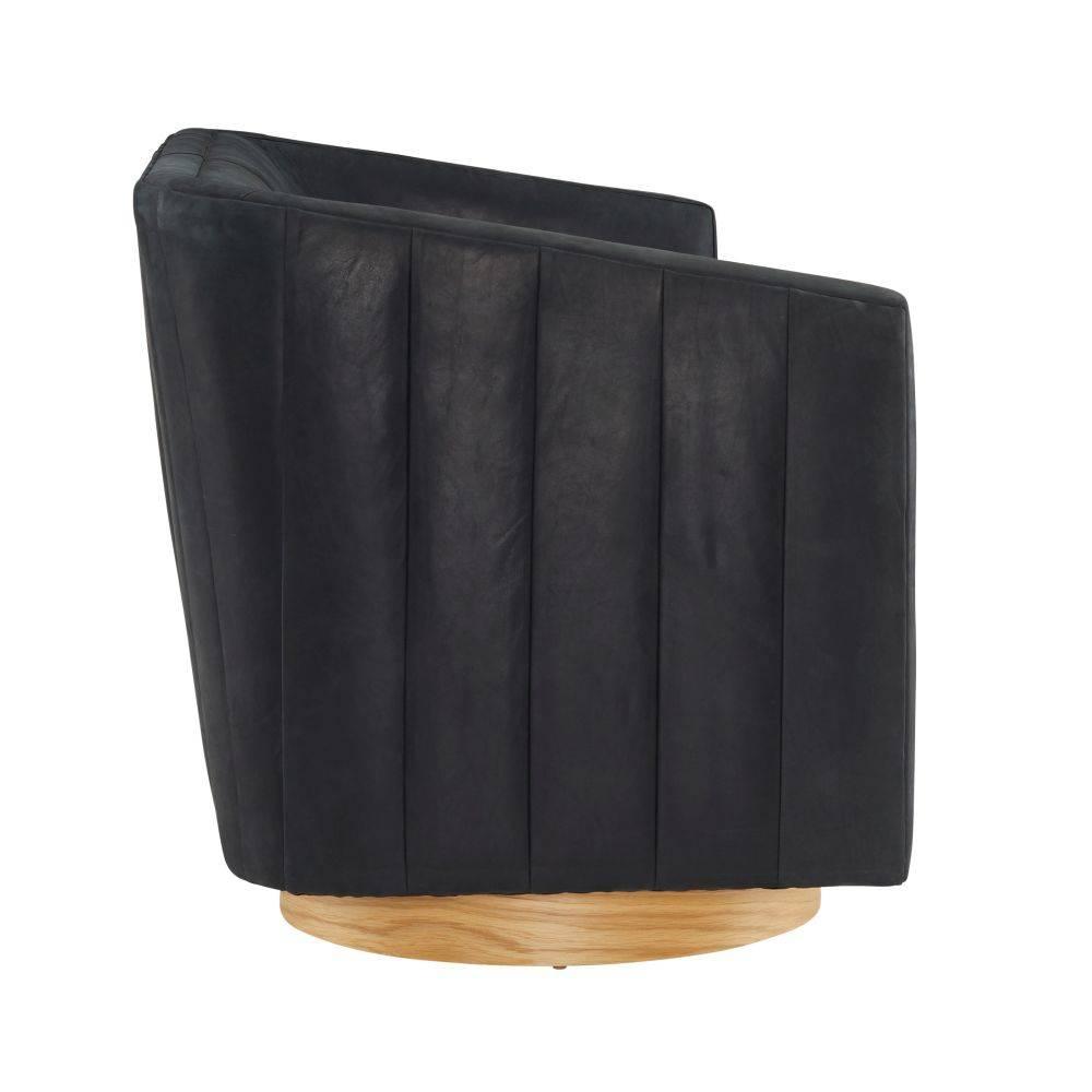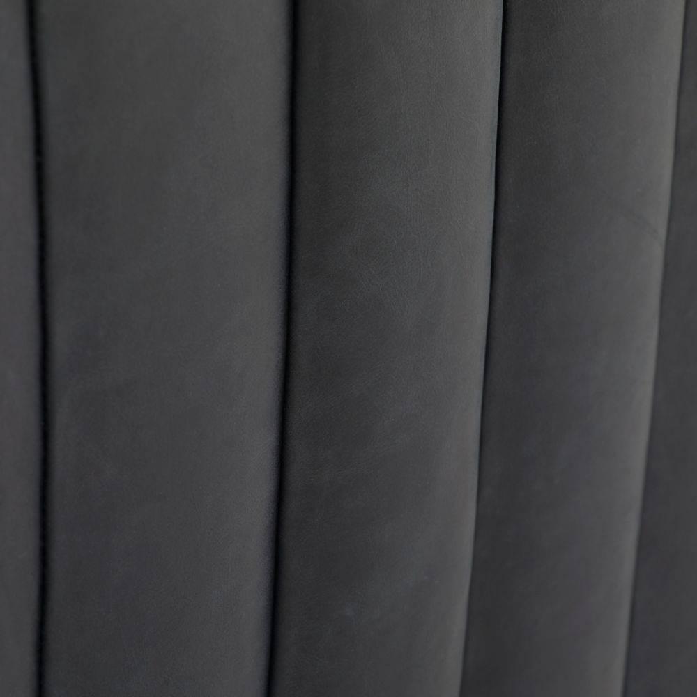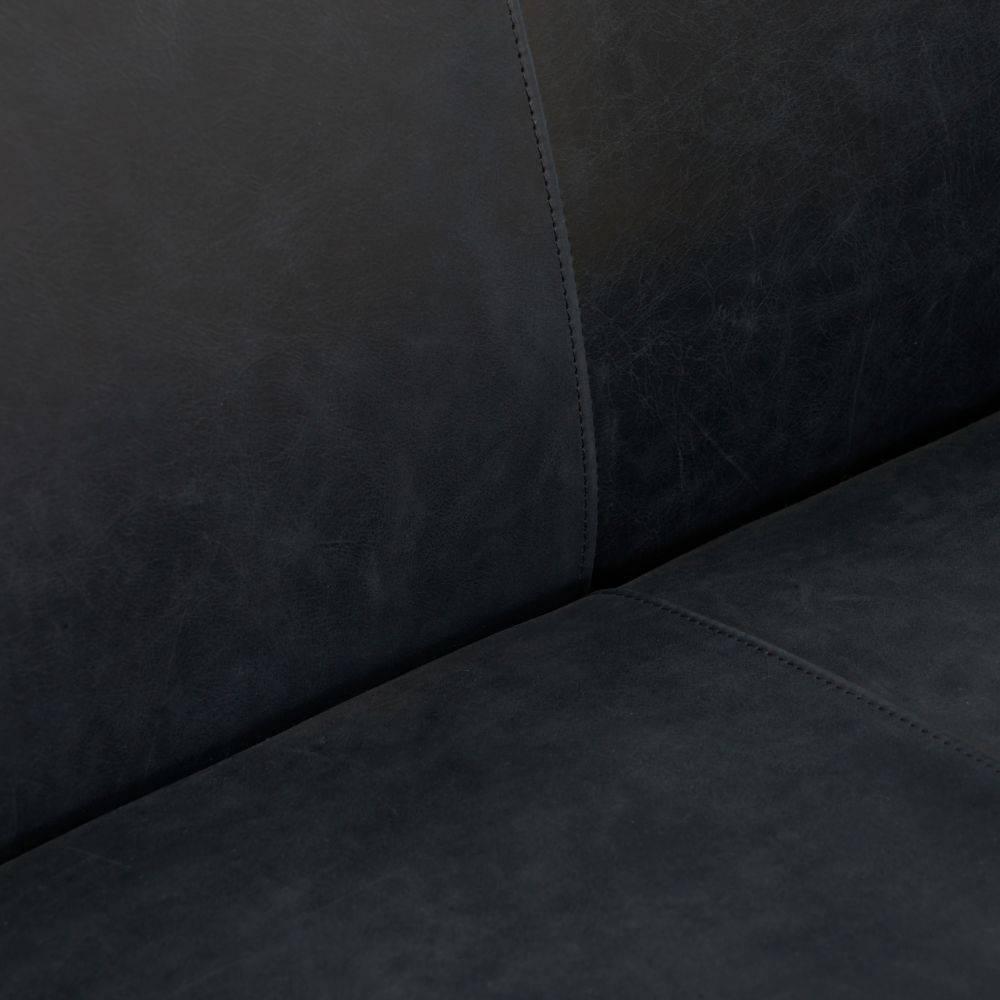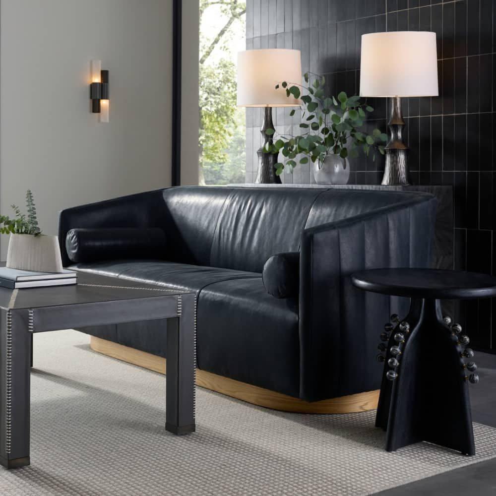 A new take on the shelter sofa, Huxley's stylish silhouette is elevated in noir leather. The rhythmic texture of back-channeled details allows it to float stylishly within a room. Sloped arms with bolster pillows lend support for seating, while a shaped plinth base of white oyster oak wood adds a contemporary contrast of material. Leather will vary.