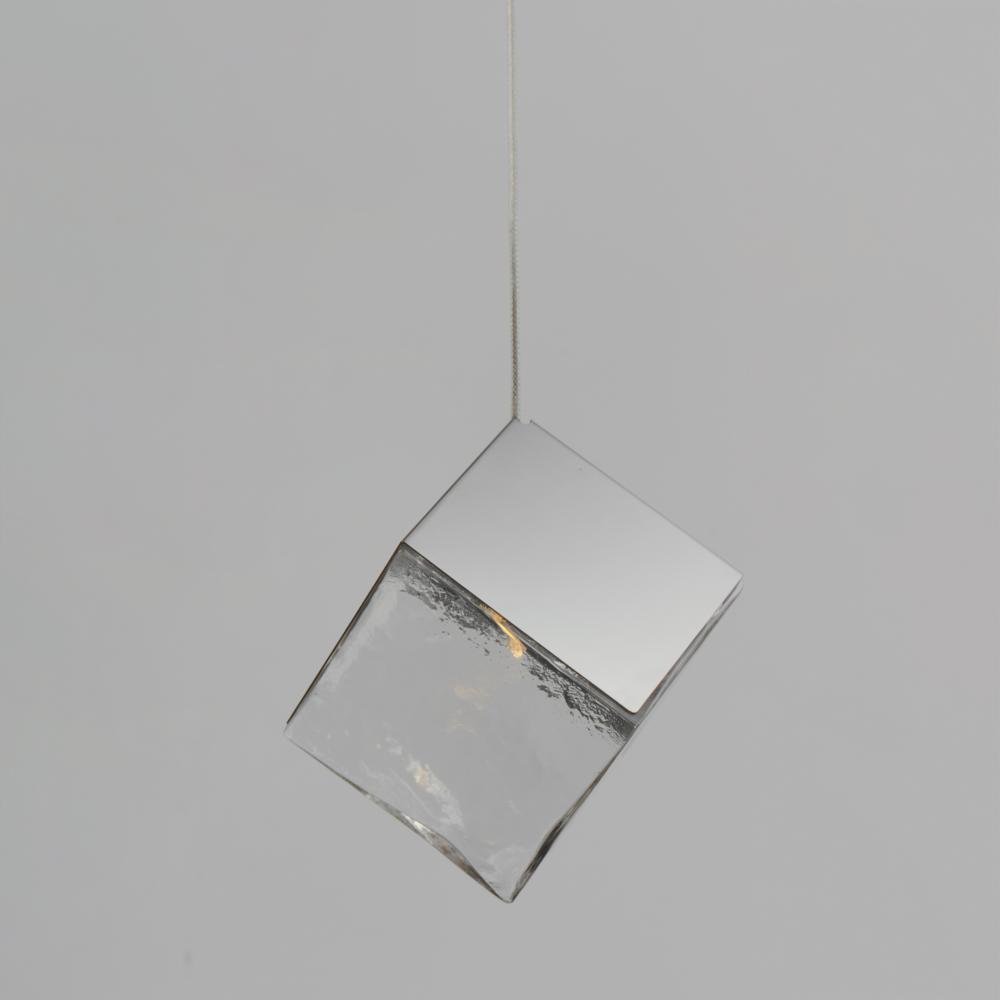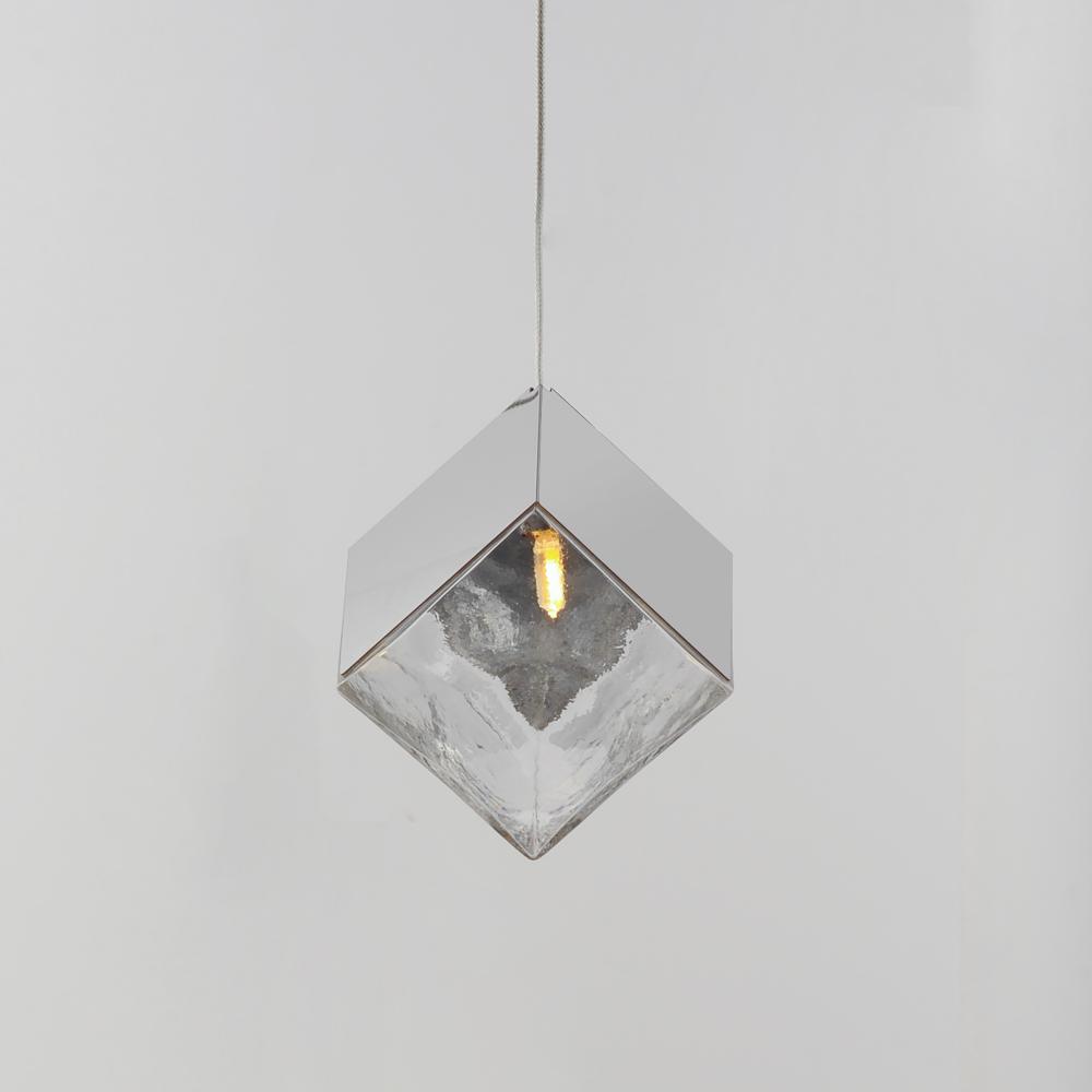 Like melting ice, these oversized cube pendants support cast glass shades from highly polished stainless-steel frames. Select from two finish combinations: a Clear glass shade paired with a Polished Chrome frame or soften the look with warm Amber glass pai
