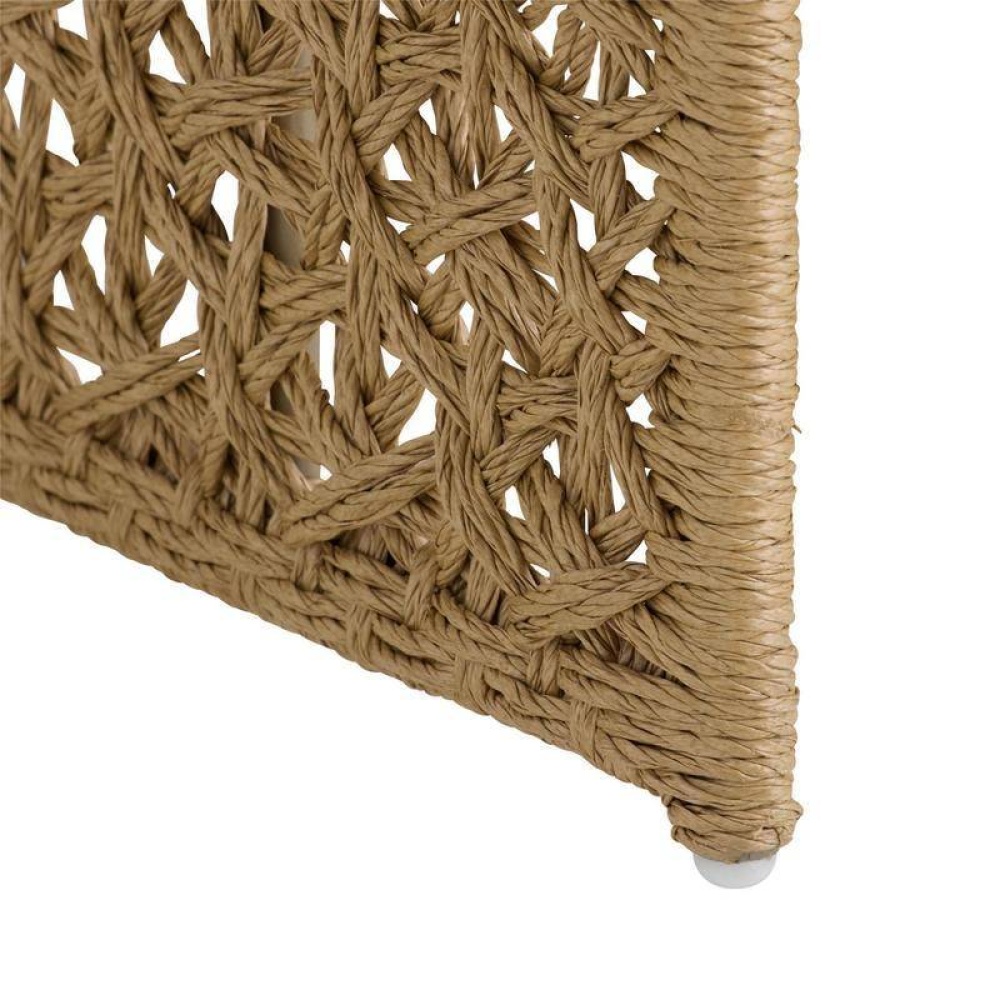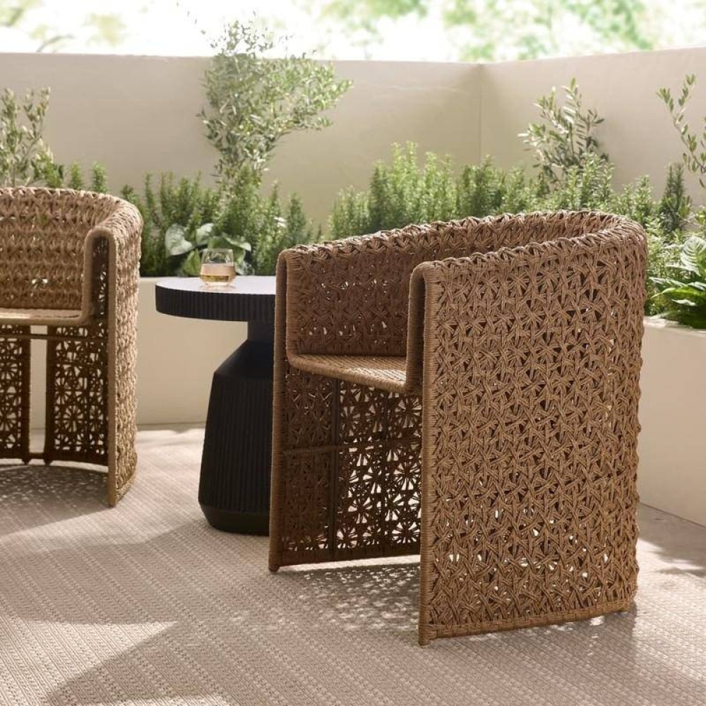 Our barrel-shaped seat delivers a sinuous line from the leg to the raised arms to the floating seat. Woven from synthetic tan rattan in a crisscross pattern, this style features an intriguing split back, allowing it to float within any outdoor living space.