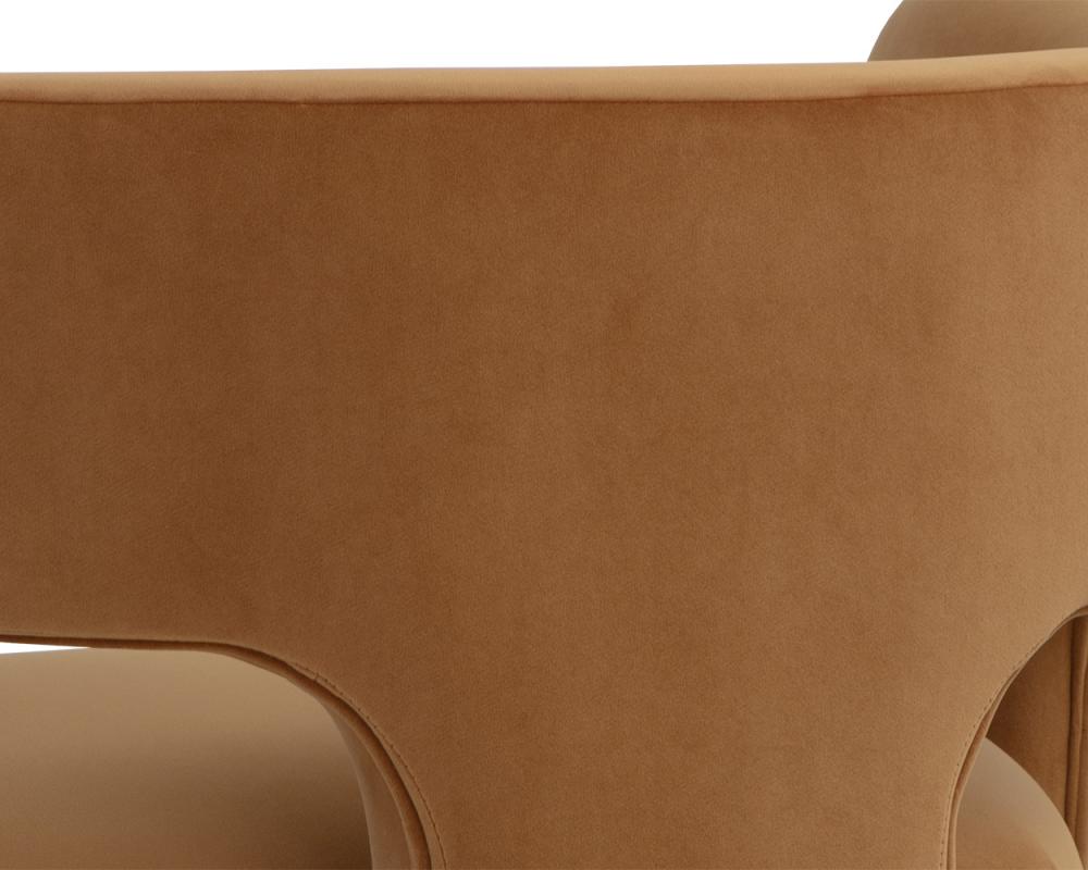 Clean lines and contoured arches add style and structure to this contemporary lounge chair. Features a curved backrest and open back for optimal comfort. Eye-catching from all angles. Fully upholstered in meg gold fabric.