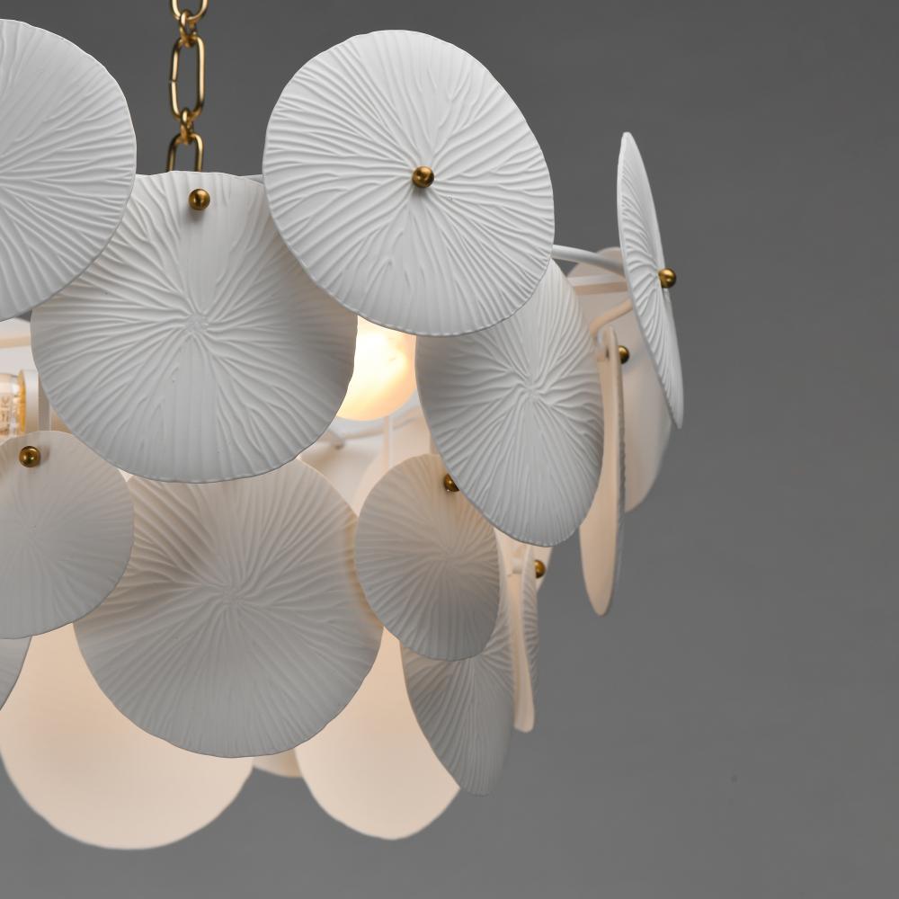 Featuring suspended tiers of textured, translucent ceramic panels, this design softly diffuses light across an undulating Matte White frame. Tiny brass knobs secure the veined ceramic panels, allowing the light to highlight their intricate texture and crea