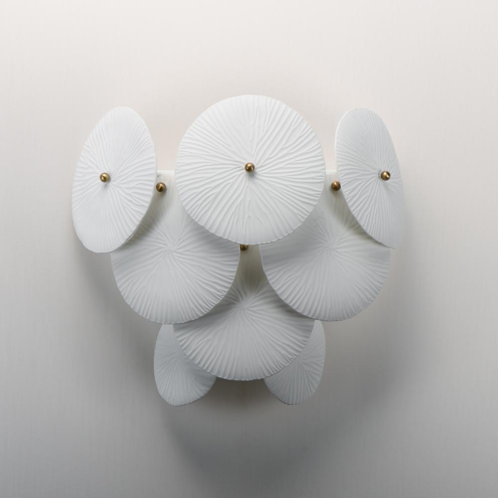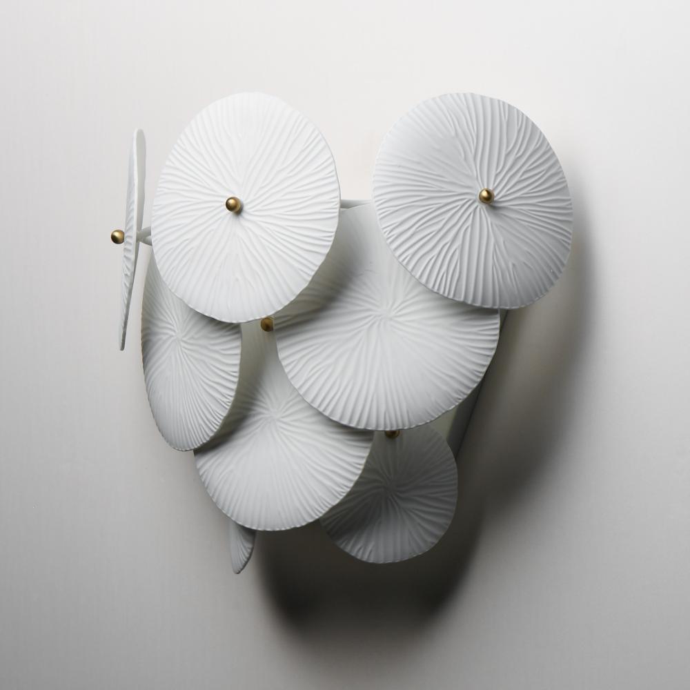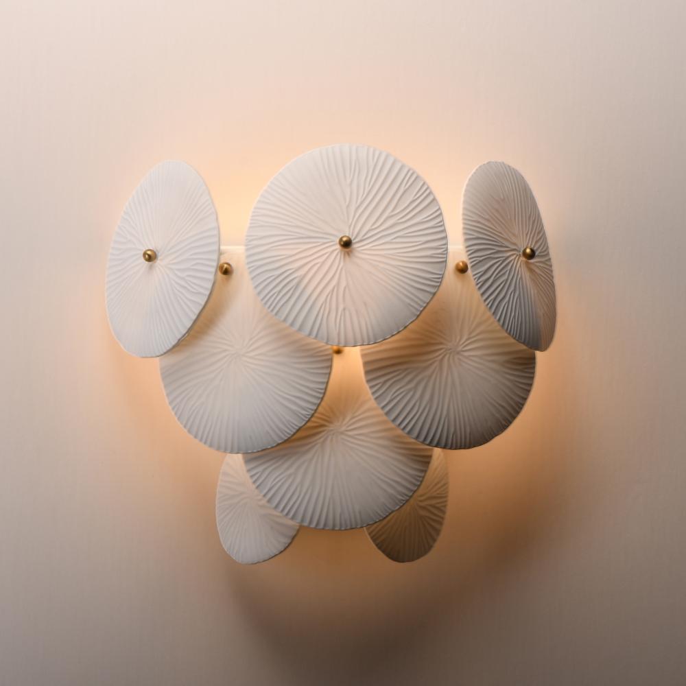 Featuring suspended tiers of textured, translucent ceramic panels, this design softly diffuses light across an undulating Matte White frame. Tiny brass knobs secure the veined ceramic panels, allowing the light to highlight their intricate texture and crea