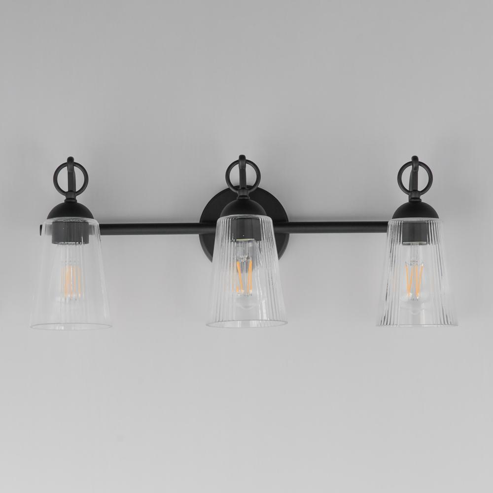 Inspired by the rugged charm of the American West, the Jackson Hole collection brings an elevated rustic sensibility to bath and vanity spaces. Tapered clear glass shades, subtly fluted with a vertical stripe detail, soften and refract light while reducing