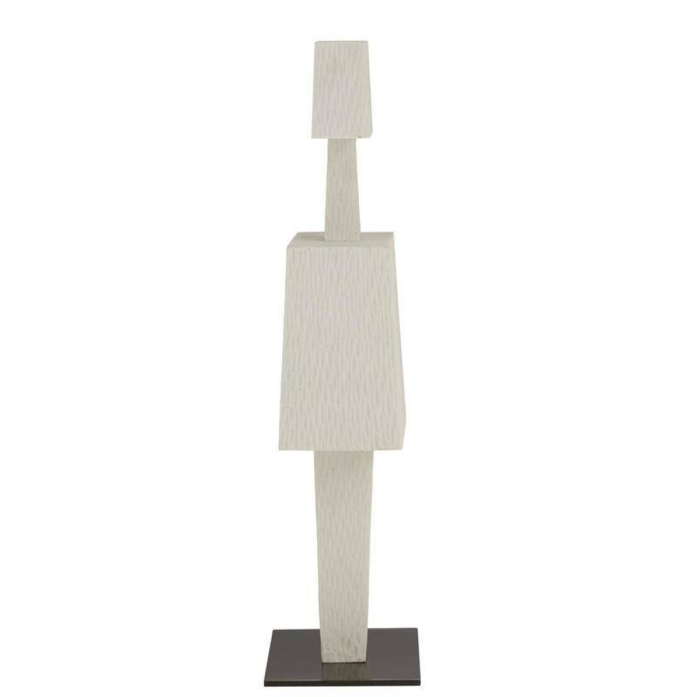 Ancient totemic forms inspired a modernist sculpture of chiseled ivory riverstone composite. Each shape combines to create a human-like figure anchored to a bronze steel base.