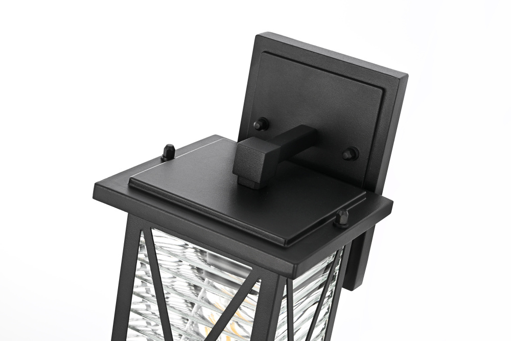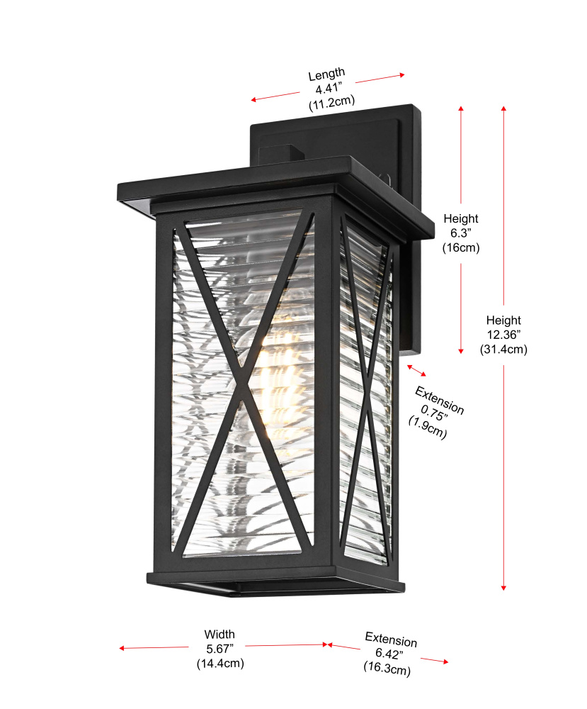 This outdoor wall light blends classic lantern styling with modern craftsmanship, featuring a rectangular metal frame, fluted glass panels, and crisscross detailing. The clear fluted glass creates a rippled effect, diffusing the light for a balanced glow while maintaining brightness. Crafted from iron and aluminum, the sturdy black-finished frame ensures long-term durability in outdoor conditions. Pre-wired with a 7-inch lead, this wall light is a strong and stylish choice for enhancing outdoor spaces. The open-bottom design allows for quick and hassle-free bulb changes, while the fixture supports a single medium-base E26 bulb (40W max, not included). Dimmable and ETL Wet Rated, this pendant light brings a structured and refined presence to exterior spaces. Built with marine-grade, corrosion-resistant aluminum, this sconce withstands coastal conditions for long-lasting durability.
