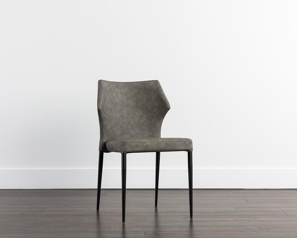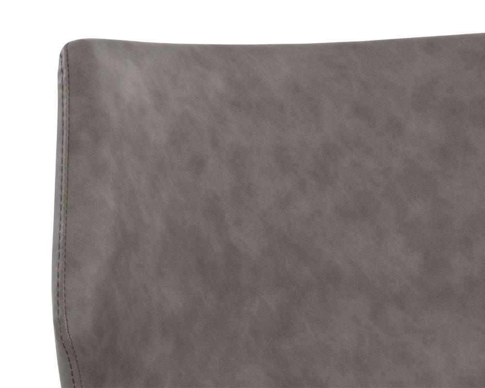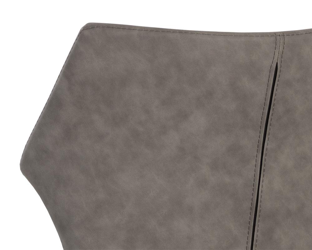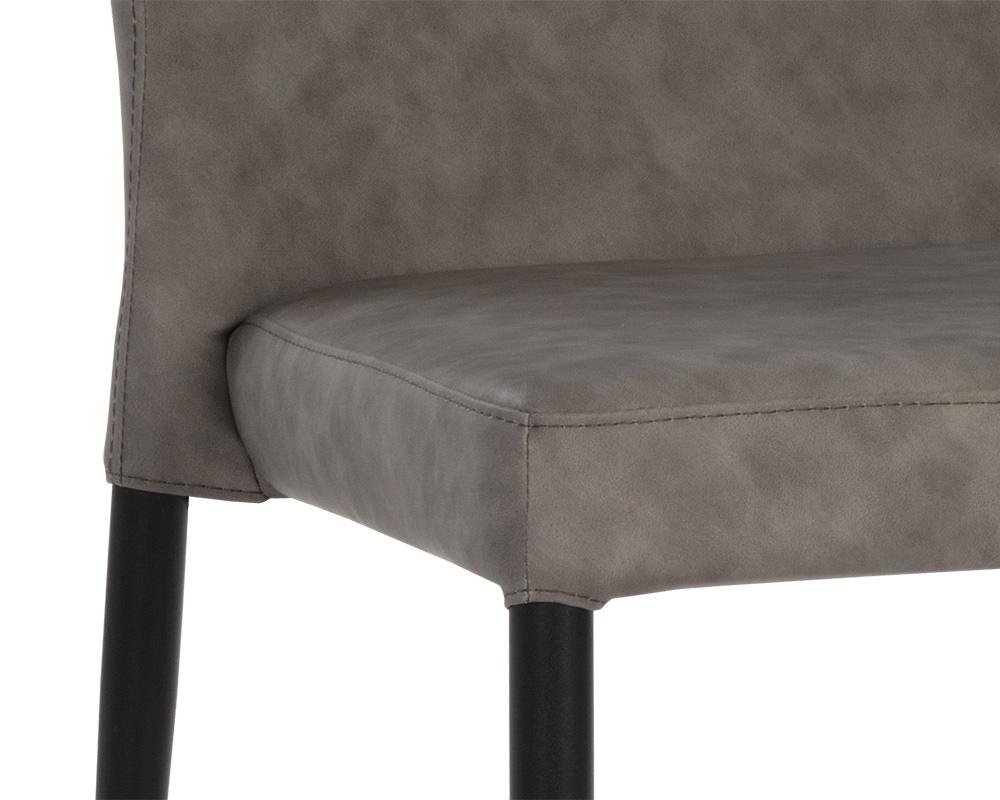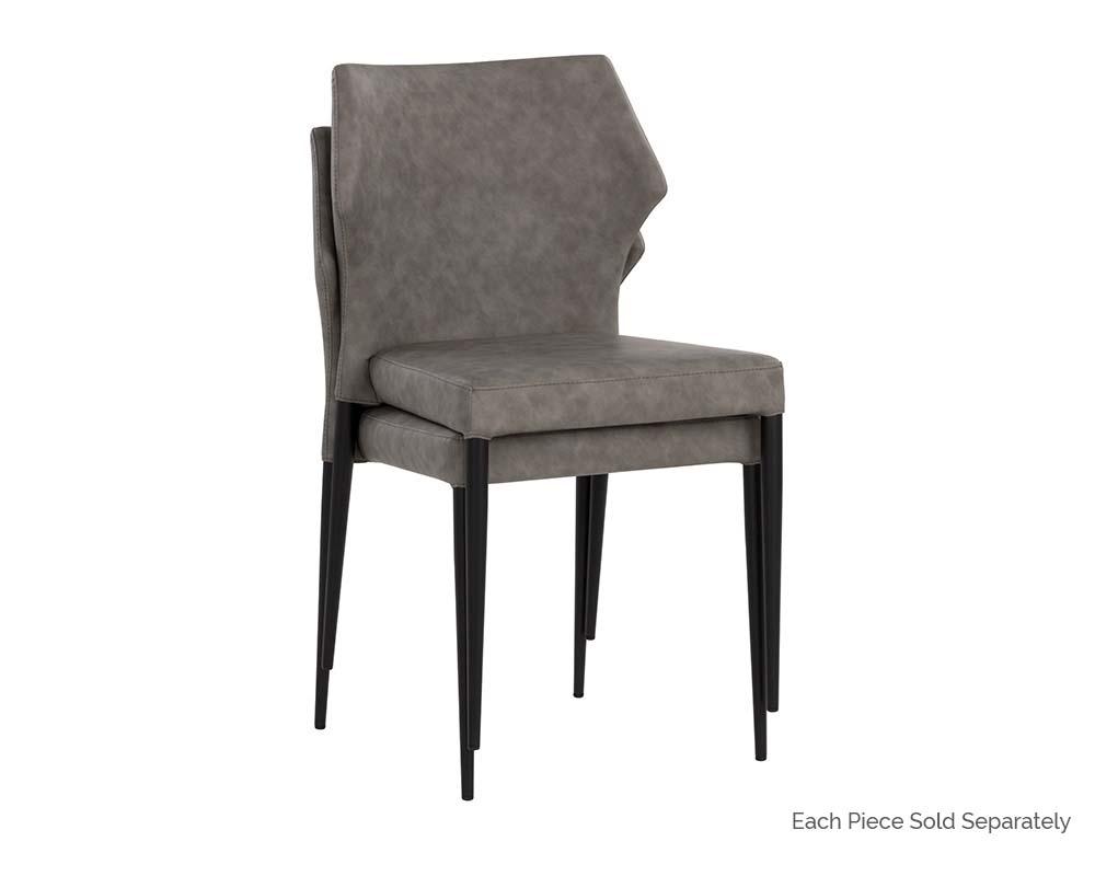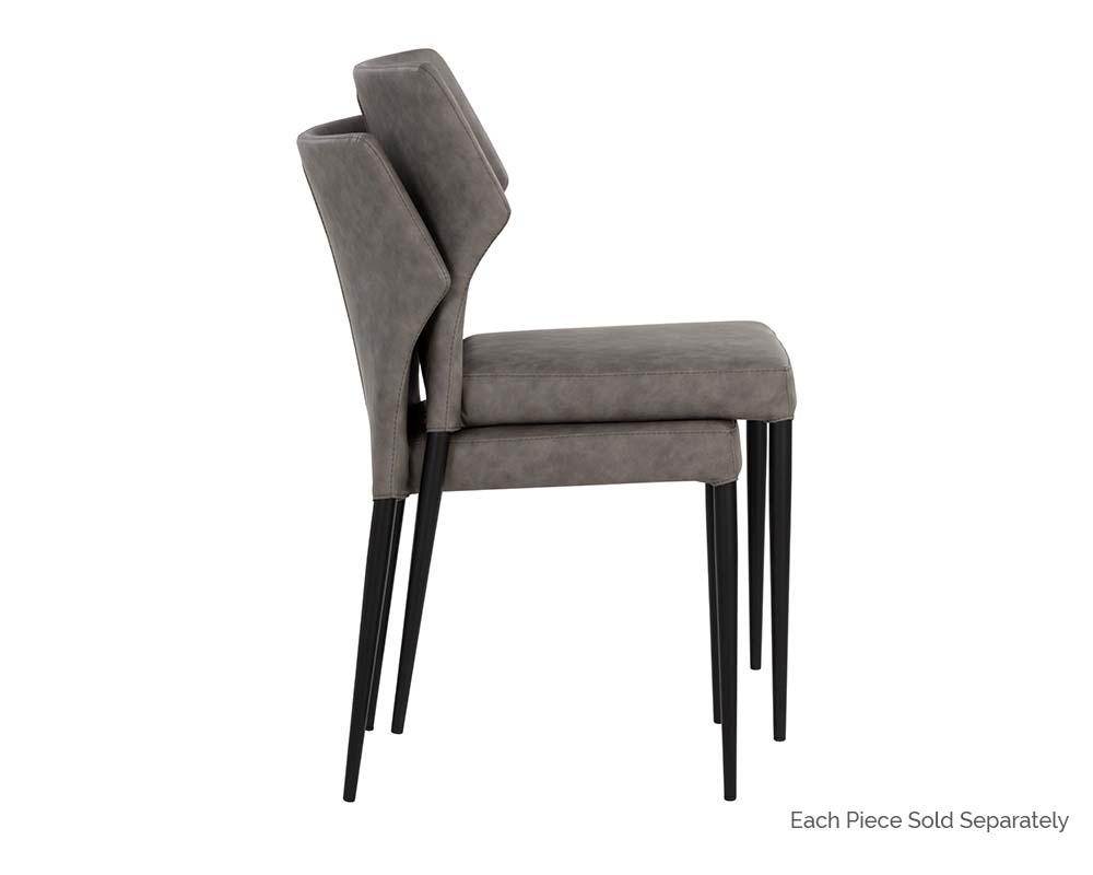 With a distinctly shaped backrest, this stackable modern dining chair is a great addition to any dining space. Stocked in bounce smoke, nut and stone faux leathers. Completed with powder coated steel legs in black. Also available in city grey and beige fabrics. Handle With Care: This design has been crafted with faux leather. Faux leather is manufactured to reflect the natural characteristics of leather; as such, colour variations, markings wrinkles, grooves, and light scratches are appreciated characteristics. No two pieces will be alike.