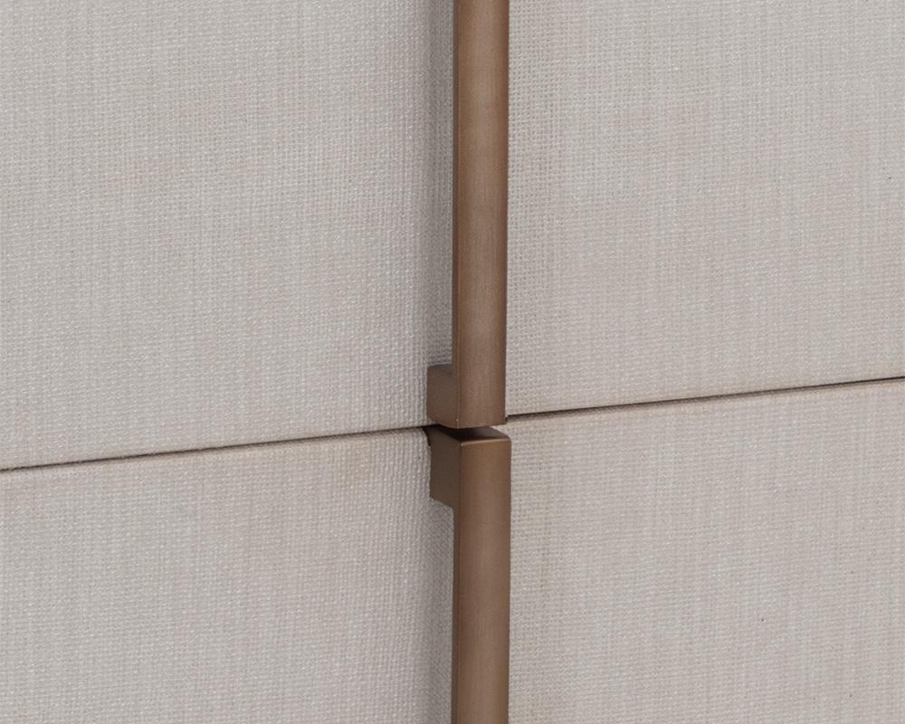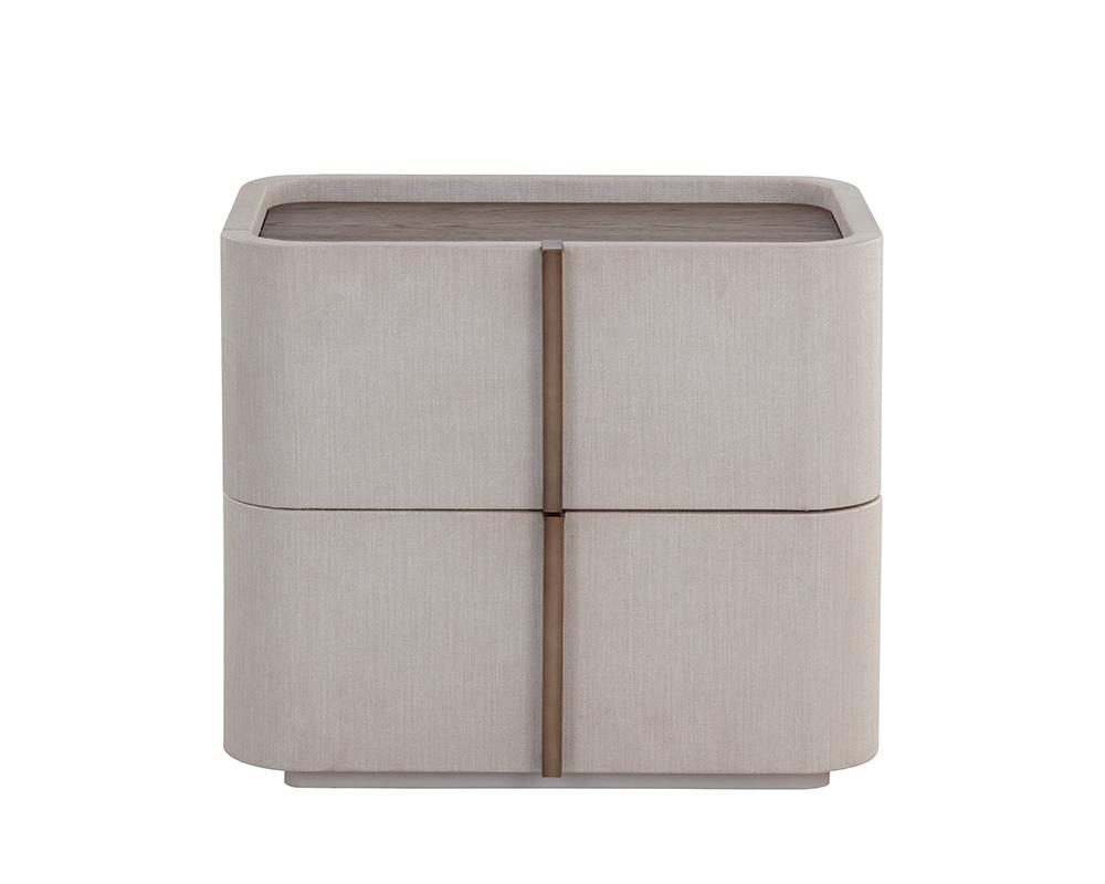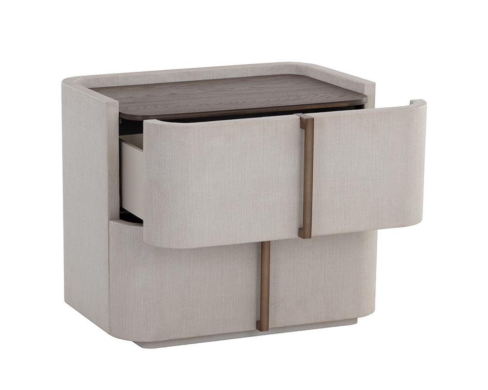 This contemporary small nightstand is defined by its beautiful and gentle curves. Upholstered in cream faux leather with a brown oak veneer tabletop that is sure to impress. Includes two drawers and completed with a rustic bronze steel base. Coordinating dresser also available, along with a larger nightstand version. Handle With Care: This design has been crafted with faux leather. Faux leather is manufactured to reflect the natural characteristics of leather; as such, colour variations, markings wrinkles, grooves, and light scratches are appreciated characteristics. No two pieces will be alike.