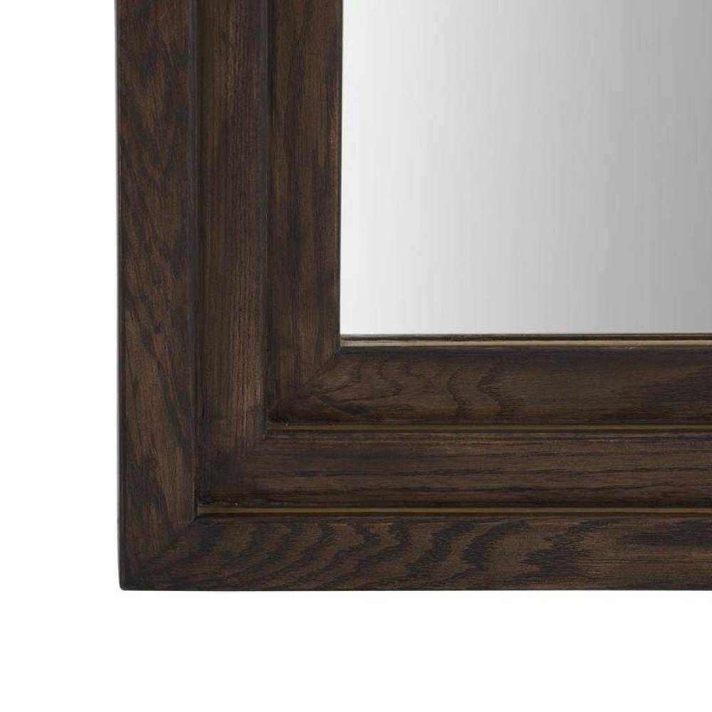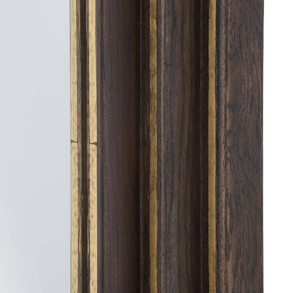 The graceful arches of doorways are reflected in an oversized tiered frame of sable oak wood. Within each carved step and along its side, an inlay of antique brass adds a subtle glimmer when the light hits, creating the illusion of depth. Designed to be hung vertically by a back cleat. Hanging hardware included. Finish will vary.