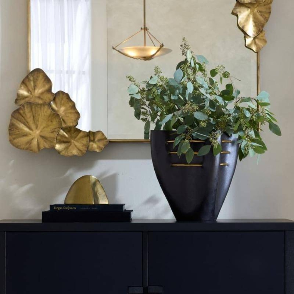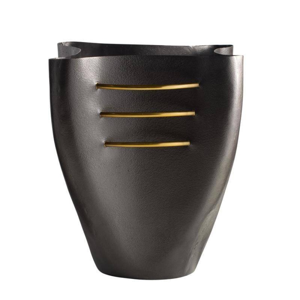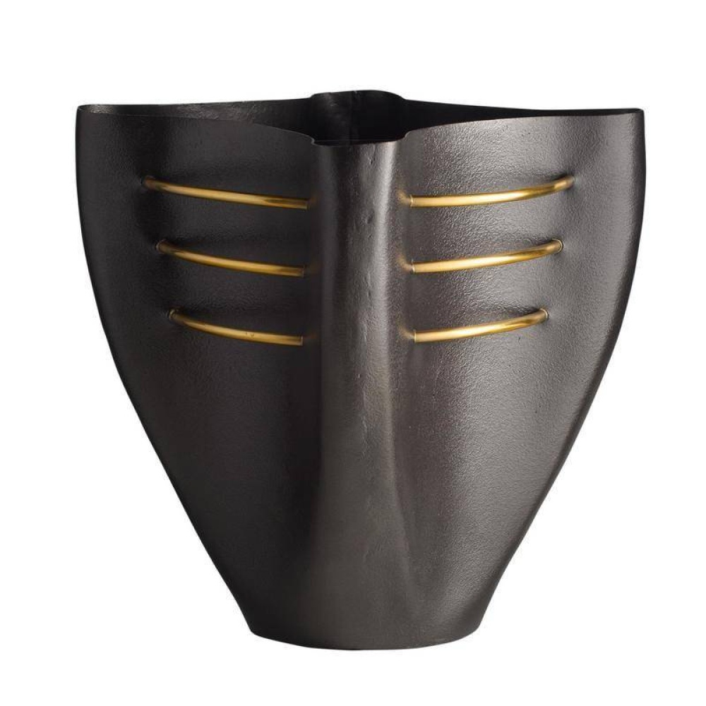 An oversized blackened cast aluminum vessel is pierced with antique brass accents creating an illusion of rings intersecting its pinched form. A glass liner allows for displaying a floral arrangement or potted plant. Finish will vary.