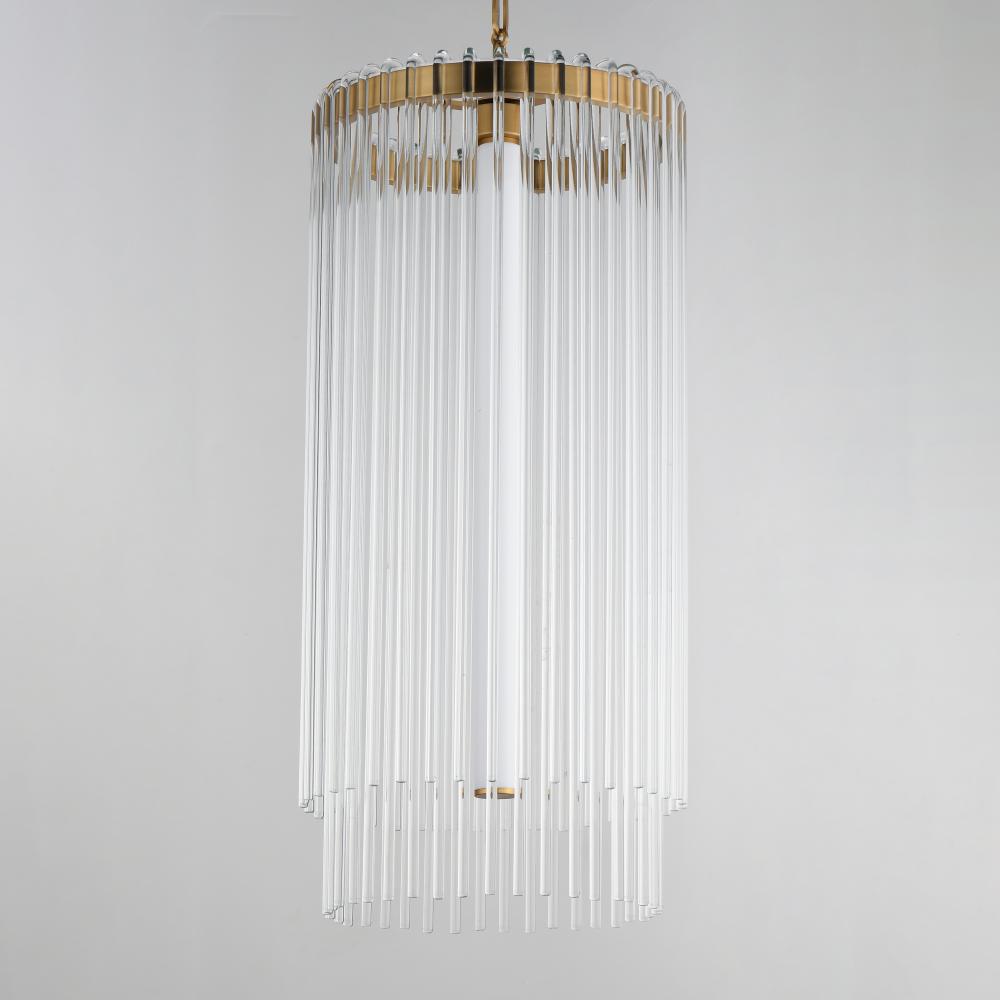 Clear glass rods elegantly curve to drape over a metal frame, encasing an integrated LED light source within. These ornamental glass rods form a luminous curtain, softly illuminated by the LEDs. The LED light source features an adjustable color temperature