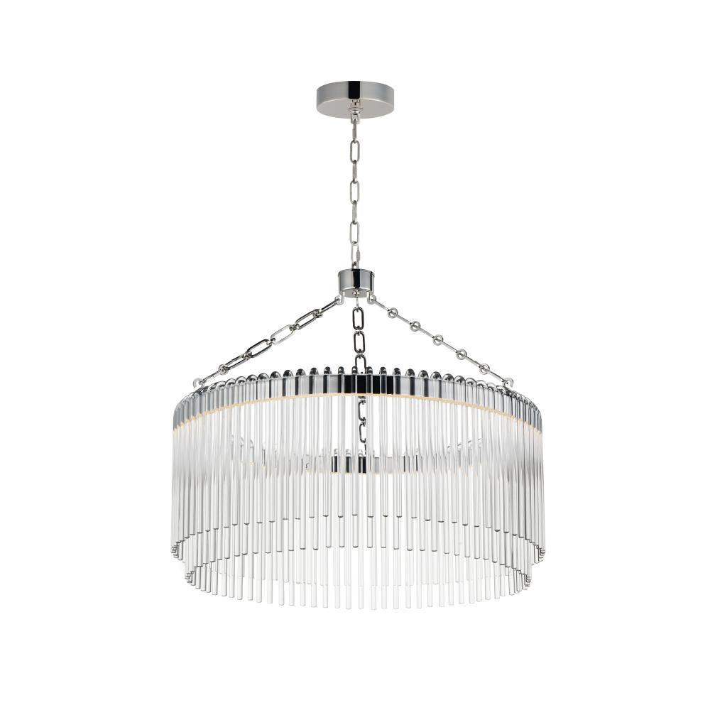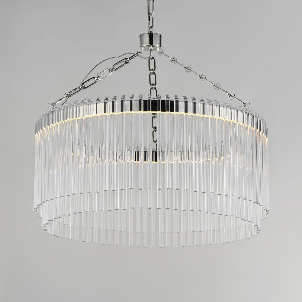 Clear glass rods elegantly curve to drape over a metal frame, encasing an integrated LED light source within. These ornamental glass rods form a luminous curtain, softly illuminated by the LEDs. The LED light source features an adjustable color temperature