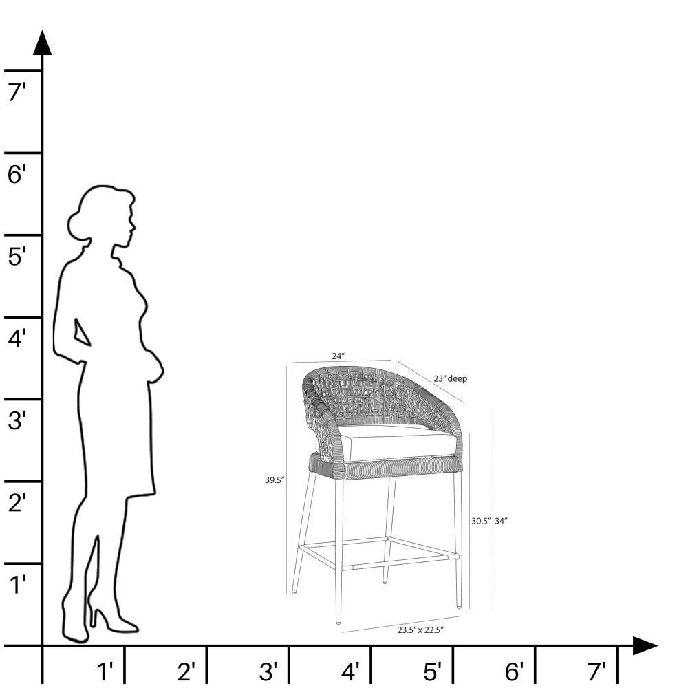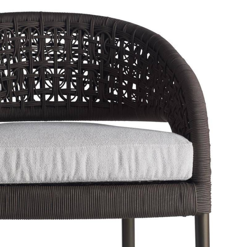 We reinvented the traditional mid-century barrel chair in a charcoal brown synthetic rope to survive the elements. Woven in an organic sculptural style, the wicker-type weave of the Juri’s curved back juxtaposes a sleek frame of dark gray aluminum and a padded cushion of porpoise outdoor performance bouclé. Accented with a stainless-steel footrest caps.