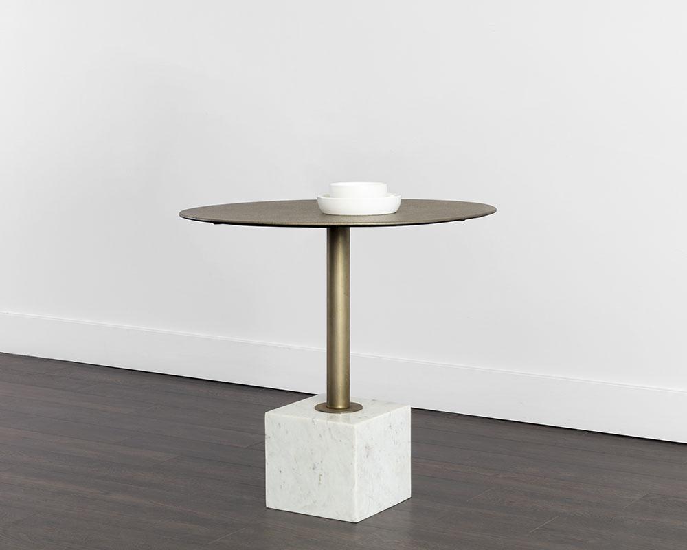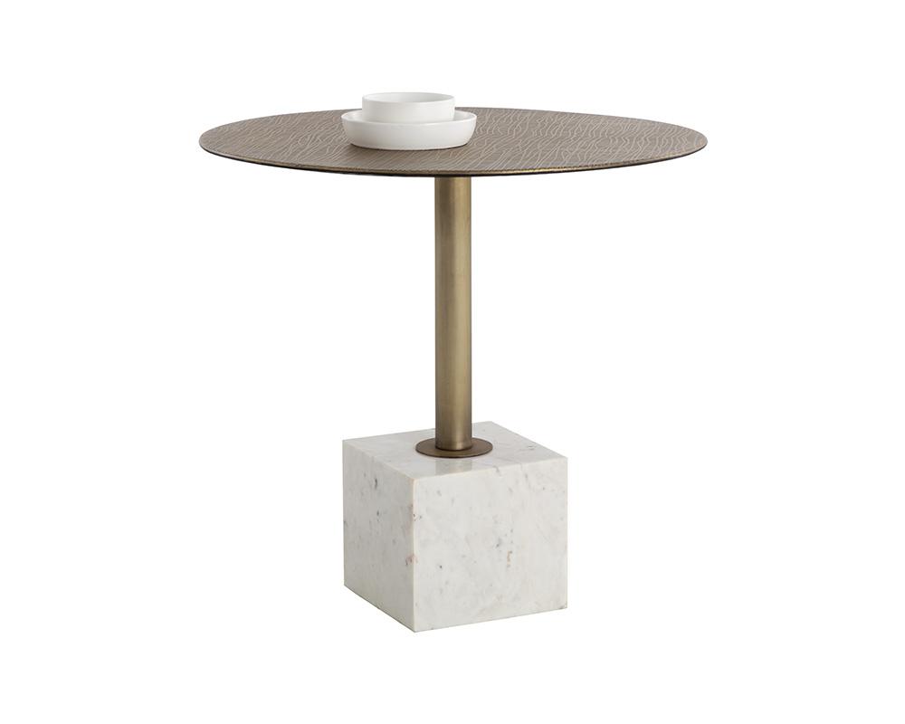Add a touch of opulence to any space with this spectacular bistro table. Features a brushed antique brass frame with mesh patterning on the tabletop. Completed with a white marble block base. Also available in grey marble. Made in India. With refined craftsmanship, this design was brought to life by skilled local artisans. By nature, these materials develop unique imperfections such as fissures, markings and colour variations for a truly one-of-a-kind piece.