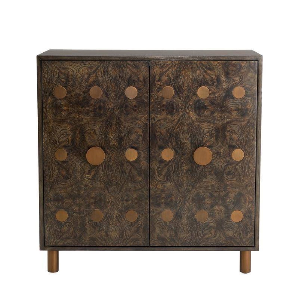 Punctuated by vintage brass inlays, this olive ash veneer cabinet is reminiscent of a fashionable tailored and buttoned vest. The truffle burl finish adds a hint of graphic glamour while playing up the dramatic contrast with the blending hardware. Double soft-close doors open to reveal two adjustable shelves. Encased in a matching truffle olive ash veneer frame. Finish will vary.