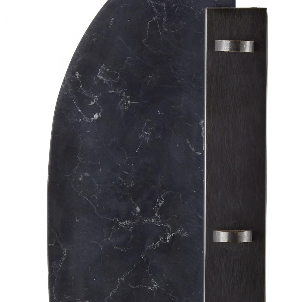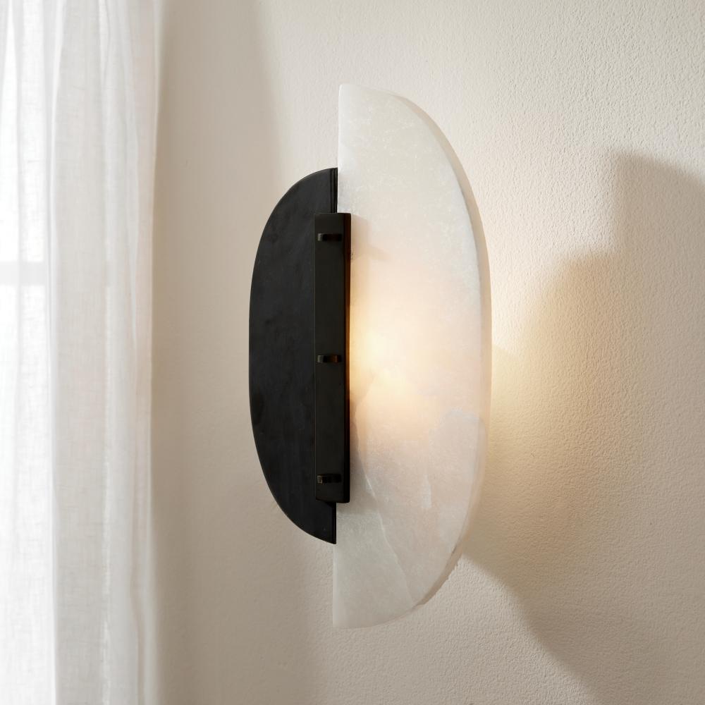 The curved door pulls of our Kianna credenza inspired the hardware on this sculptural sconce. Crafted in alabaster overlaid with an asymmetrical plate of black marble, it delivers both style and function through artistic, architectural elements. Accented in English bronze steel. Finish will vary.