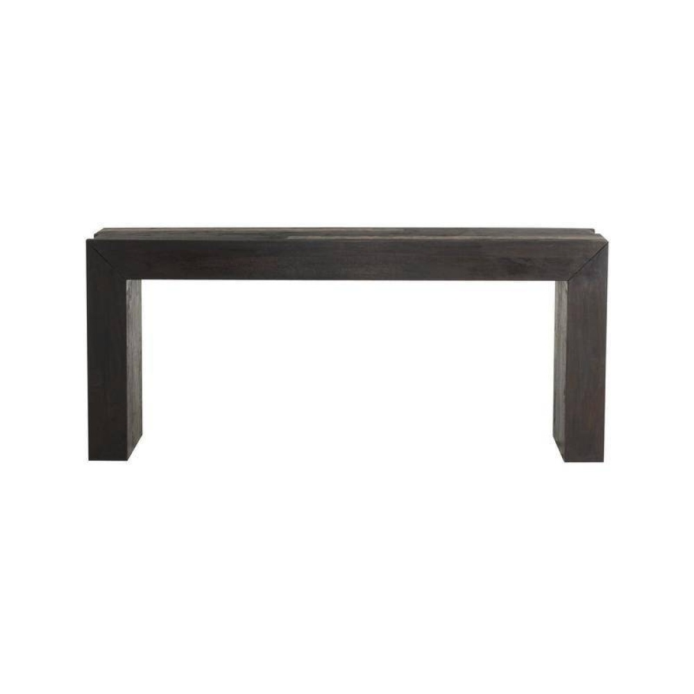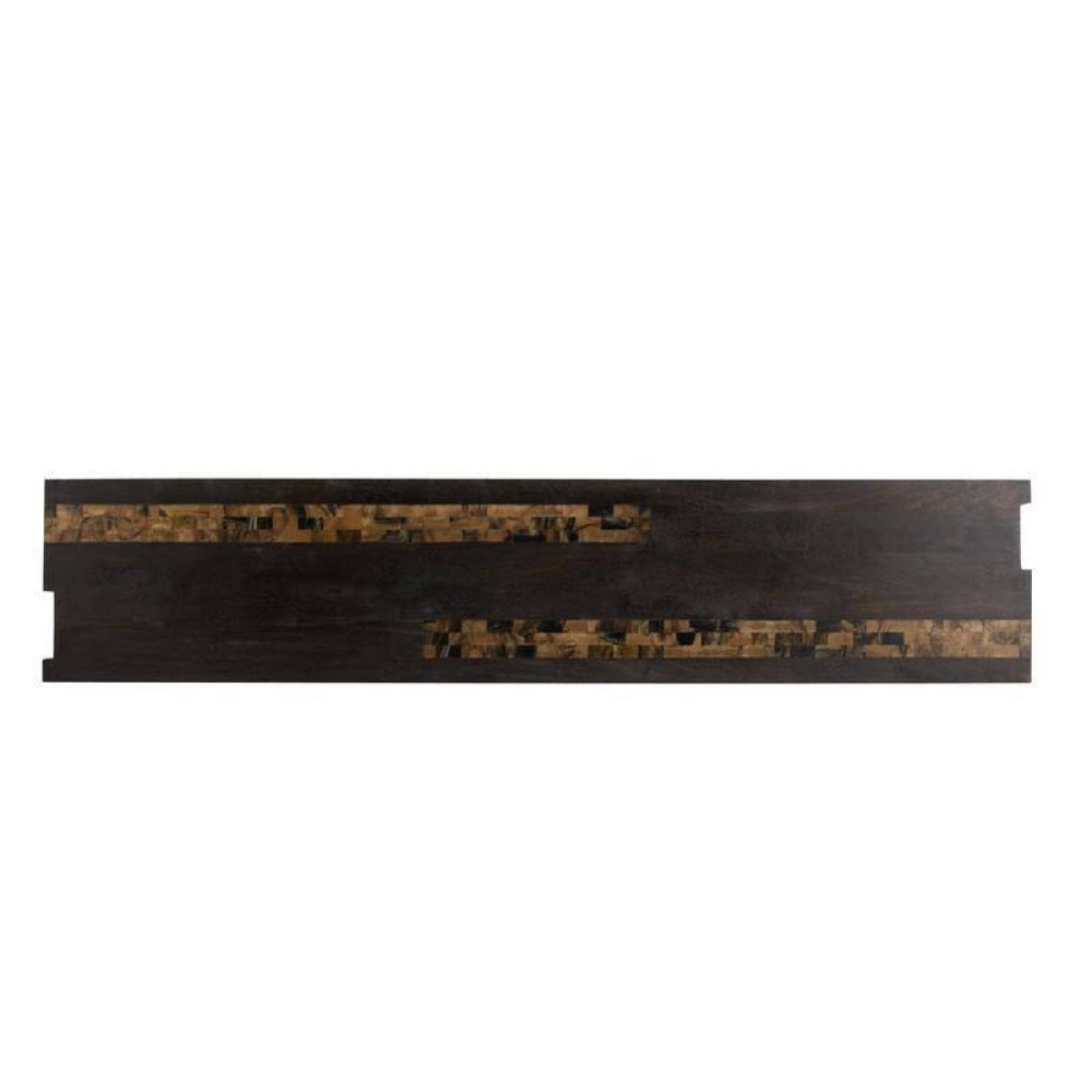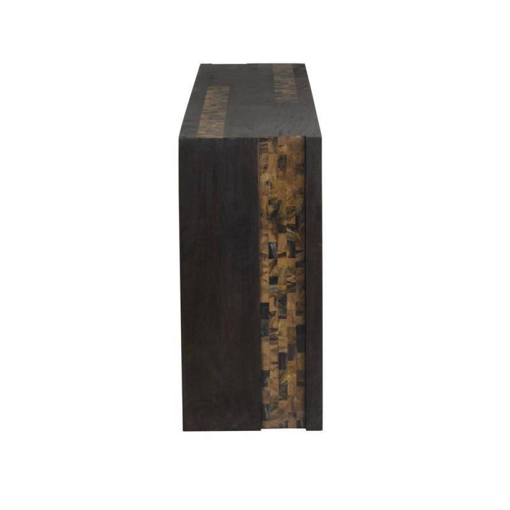 The thick waterfall silhouette of this umber mango wood table makes a chic statement in the entry or hallway. An inset of racing stripe of natural faux horn resin cascades from the narrow top down the sides, assuring a visual impact from every angle. Finish will vary.