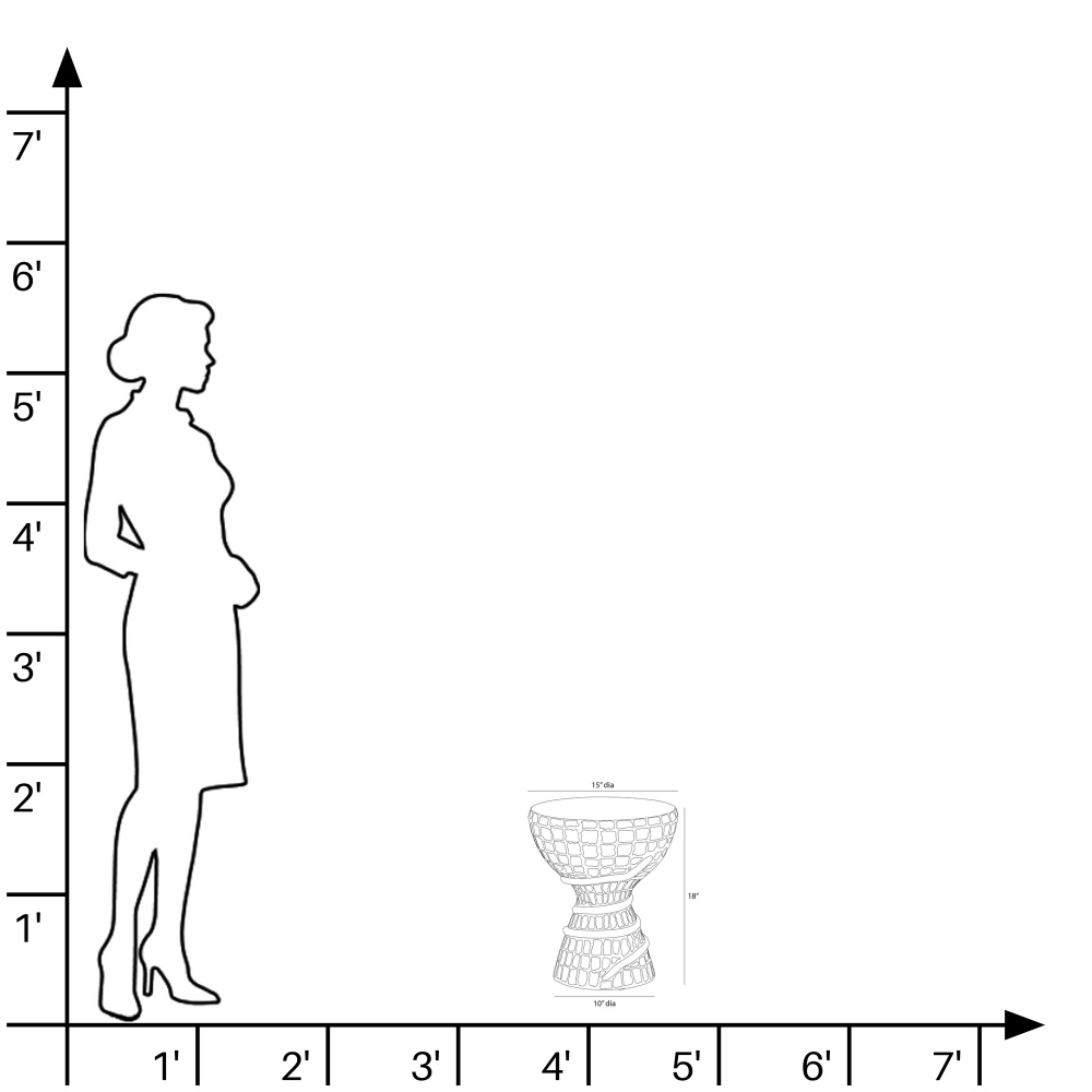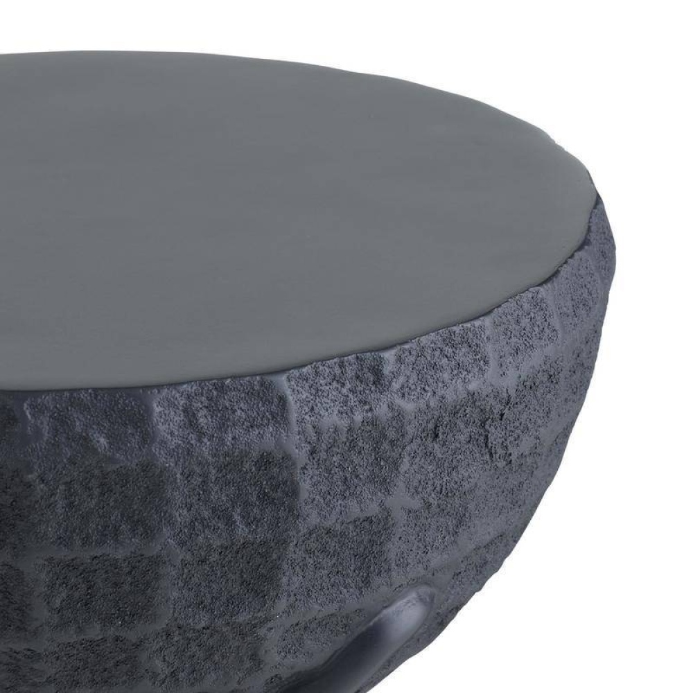 Formed in a classic drum shape, this resin table in black volcanic ash possesses a carved texture to showcase the hand of its maker. Accented with a snake-like detail, it is lightweight for easy portability, with a lower height that makes it an ideal companion for a favorite chaise or daybed.