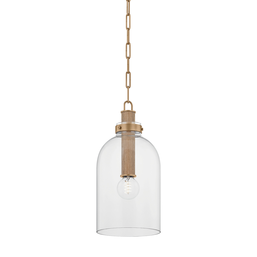 The Kori pendant follows the vein of Japanese modernism with a minimalist cloche-shaped glass design accented by elevated details. A grass cloth wrapped tube extends through the center of the clear glass shade, adding textural interest. Finished in Patina Brass, the thick metal hardware introduces an industrial edge. Despite its distinctive features, Kori’s simplicity of form allows it to be hung in multiples across various spaces. Available in two sizes.